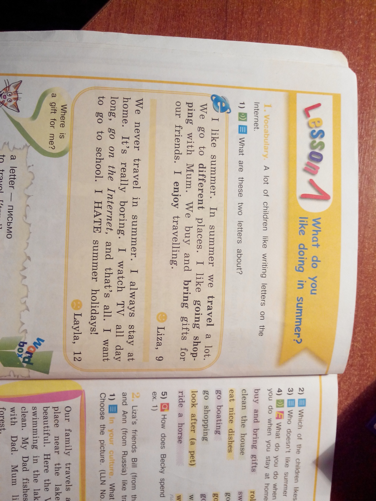 Мы никогда не путешествуем летом. Я всегда остаюсь дома. Это реально скучно. Я смотрю телевизор весь день, сижу в интернете, и это всё. Я хочу пойти в школу. Я НЕНАВИЖУ летние каникулы!