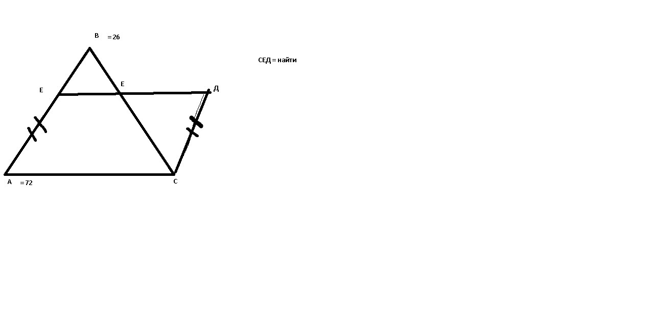 По FD//AC и секущей FA следует, что угол А + угол F=180 градусов(т.к. Углы односторонние). При FD//AC и секущей FA следует, что угол А=углу BFE(как соответственные). Тогда угол BEF=180 гр.-угол B-угол BFE= 180-26-72=82гр. Угол FEB= углу CED( как вертикальные), следовательно, угол CED=82 гр.