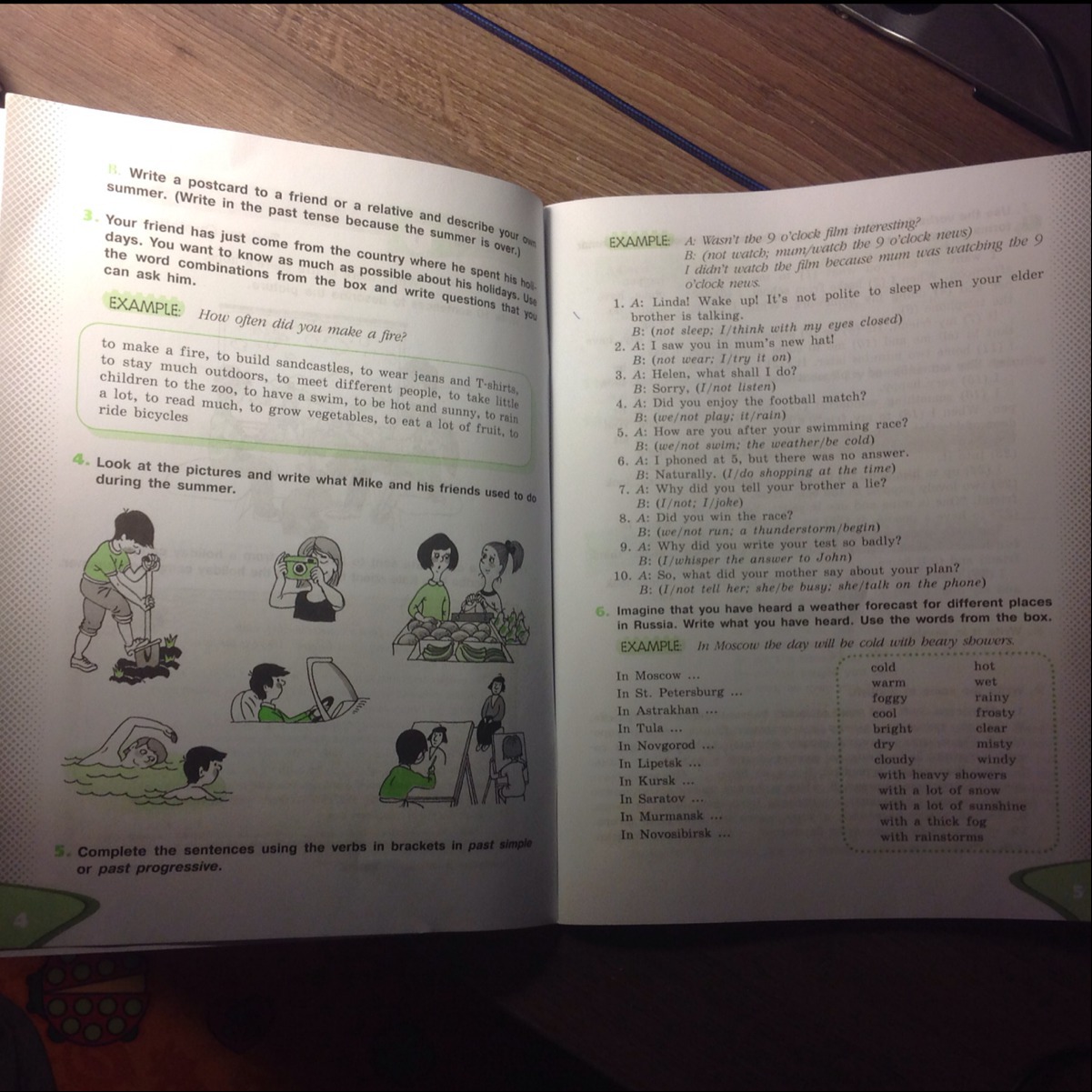 1. I am not sleeping, I am thinking with my eyes closed. 2. I wasn't wearing the hat, I tried it on. 3. Sorry, I wasn't listening. 4. We didn't play because it rained. 5. We didn't swim because the weather was cold. 6. I did shopping at the time. 7. I didn't, I joked. 8. We didn't run because a thunderstorm began. 9. I whispered the answers to John. 10. I didn't tell her because she was busy, she talked on the phone (хотя по идеи должно быть she was talking on the phone, но в оригинале нет be).