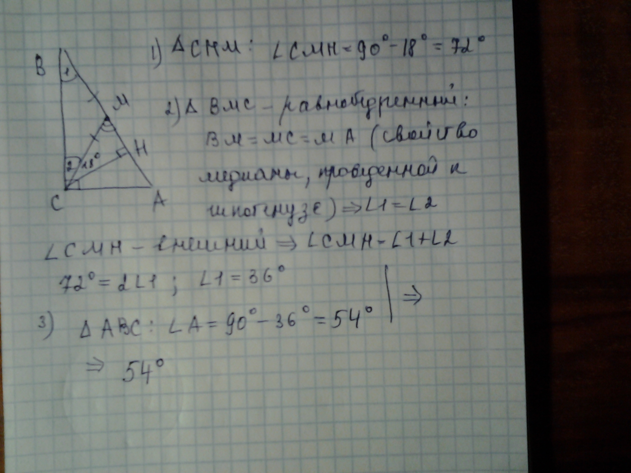 в прямоугольном треугольнике гол между высотой и медианой, проведёнными из вершины прямого угла, равен 18 градусов. Найдите больший угол данного треугольника. Ответ дайте в градусах.