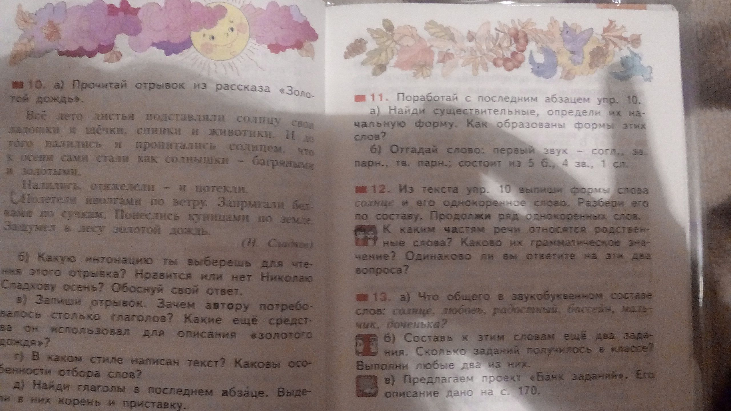 Иволгами(иволга),по ветру(ветер),белками(белка),по сумкам(сумка),куницами(куница),по земле(земля),в лесу(лес),дождь(дождь).