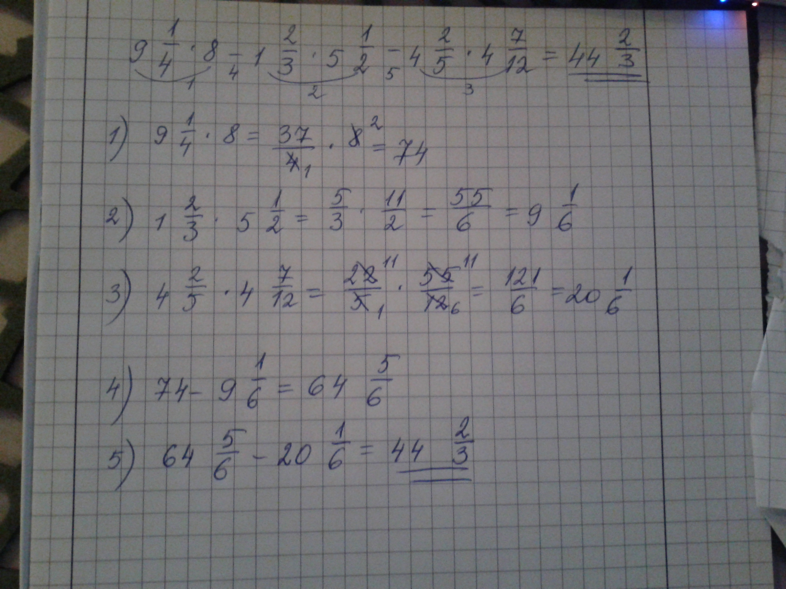 9 Целых 1 дробь 4 умнож. 8 - 1 целая 2 дробь 3 умнож. 5 целых 1 дробь 2 - 4 целых 2 дробь 5 умнож. 4 целых 7 дробь 12