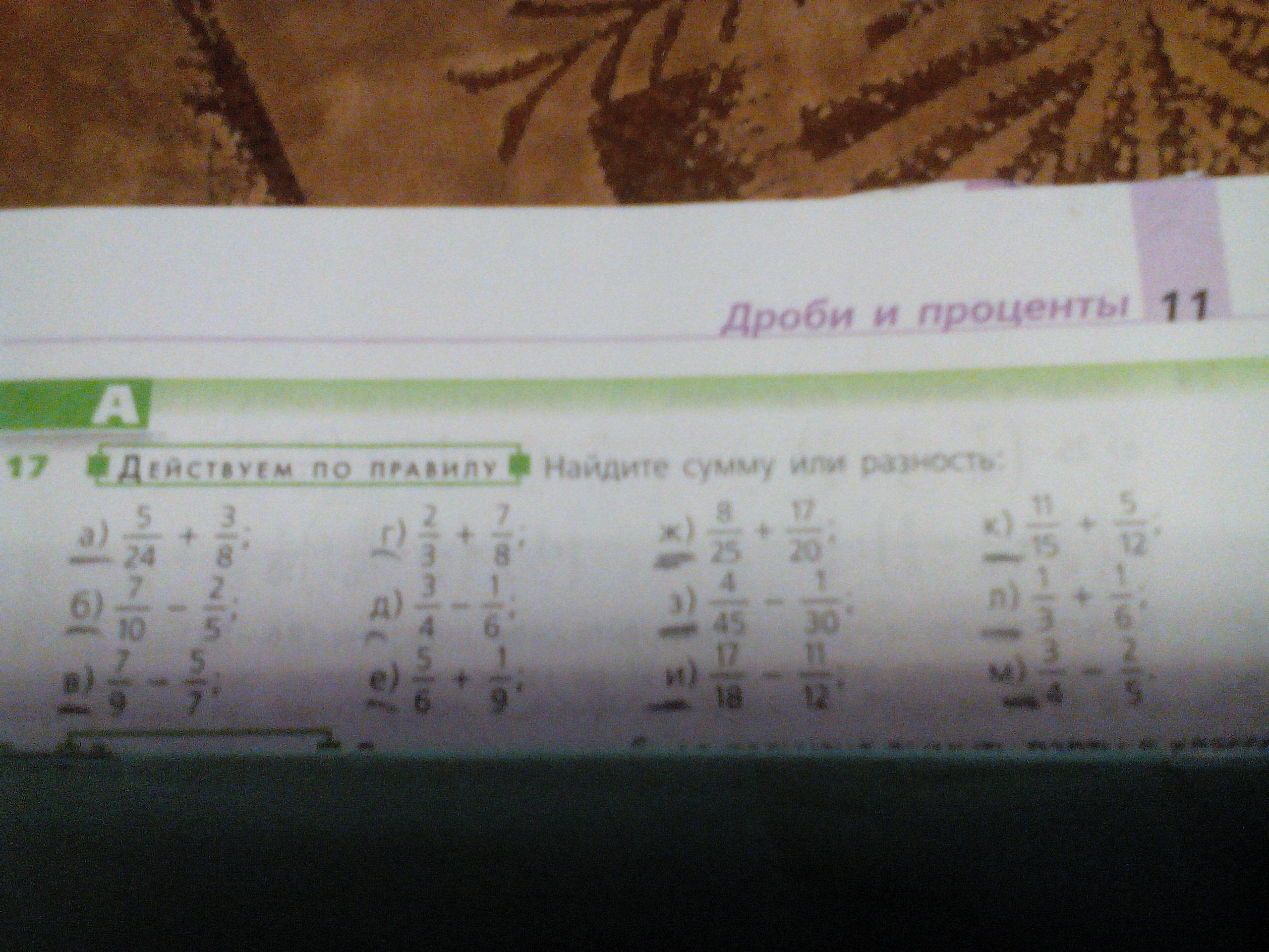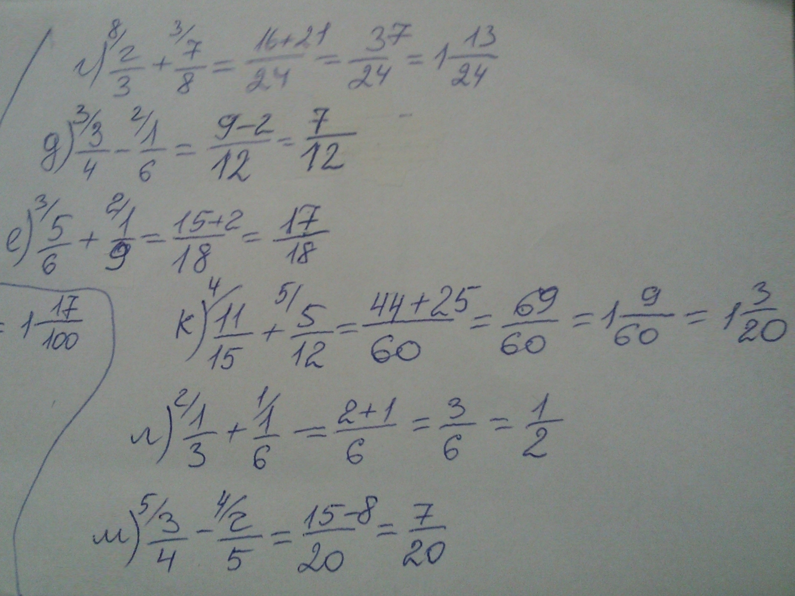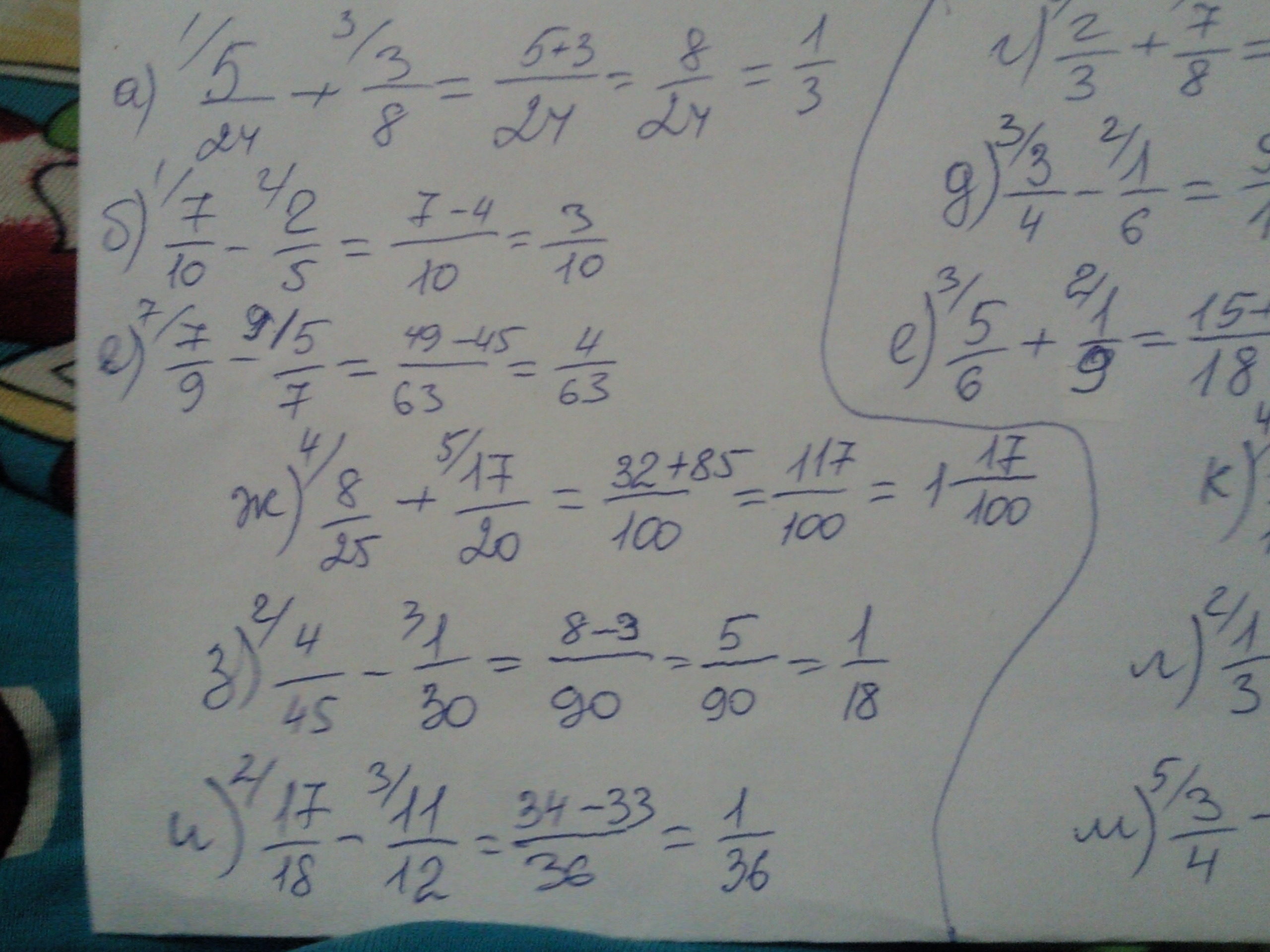в первом примере я ошиблась вот правильное решение а) 5/24+3/8=5+9/24=14/24=7/12 а то все остальное правильно