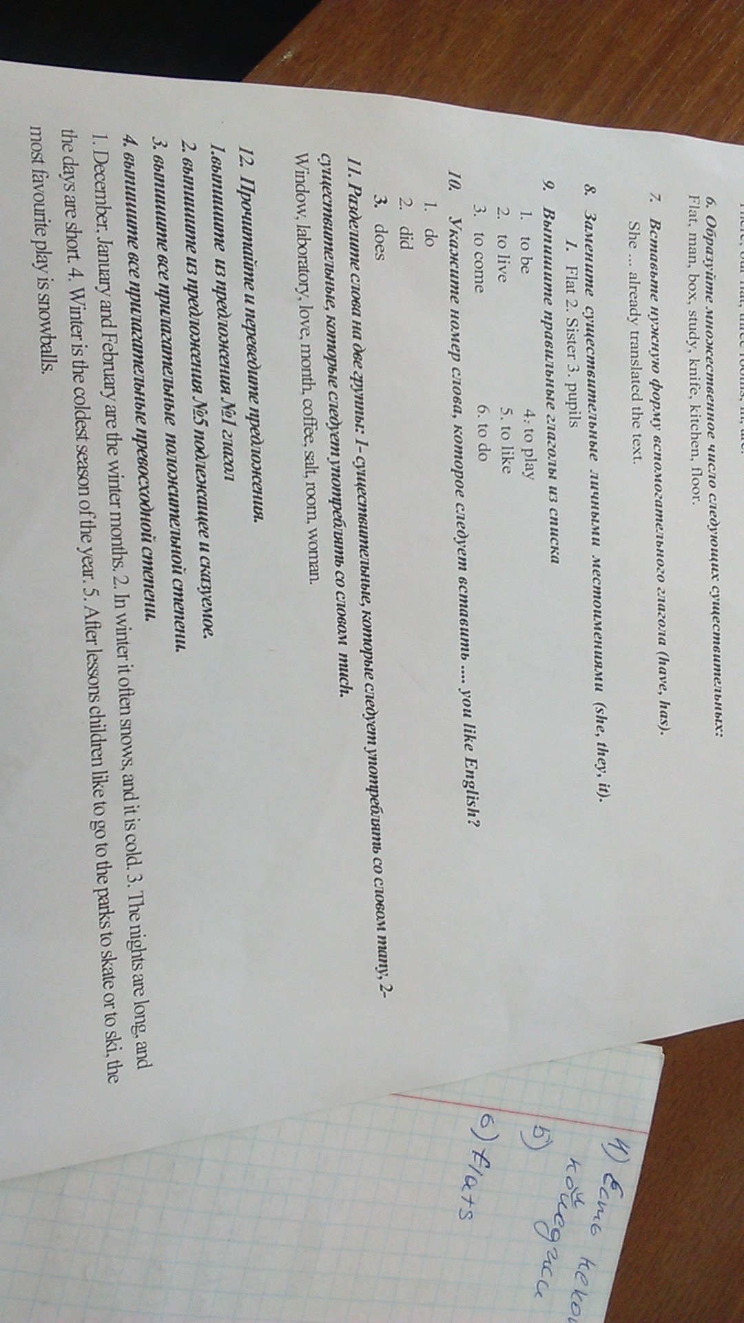 6. Flats, men, boxes, studies, knives, kitchens, floors. 7. Has. 8. It, she, they. 9. To live, to play, to like. 10. 1-Do.