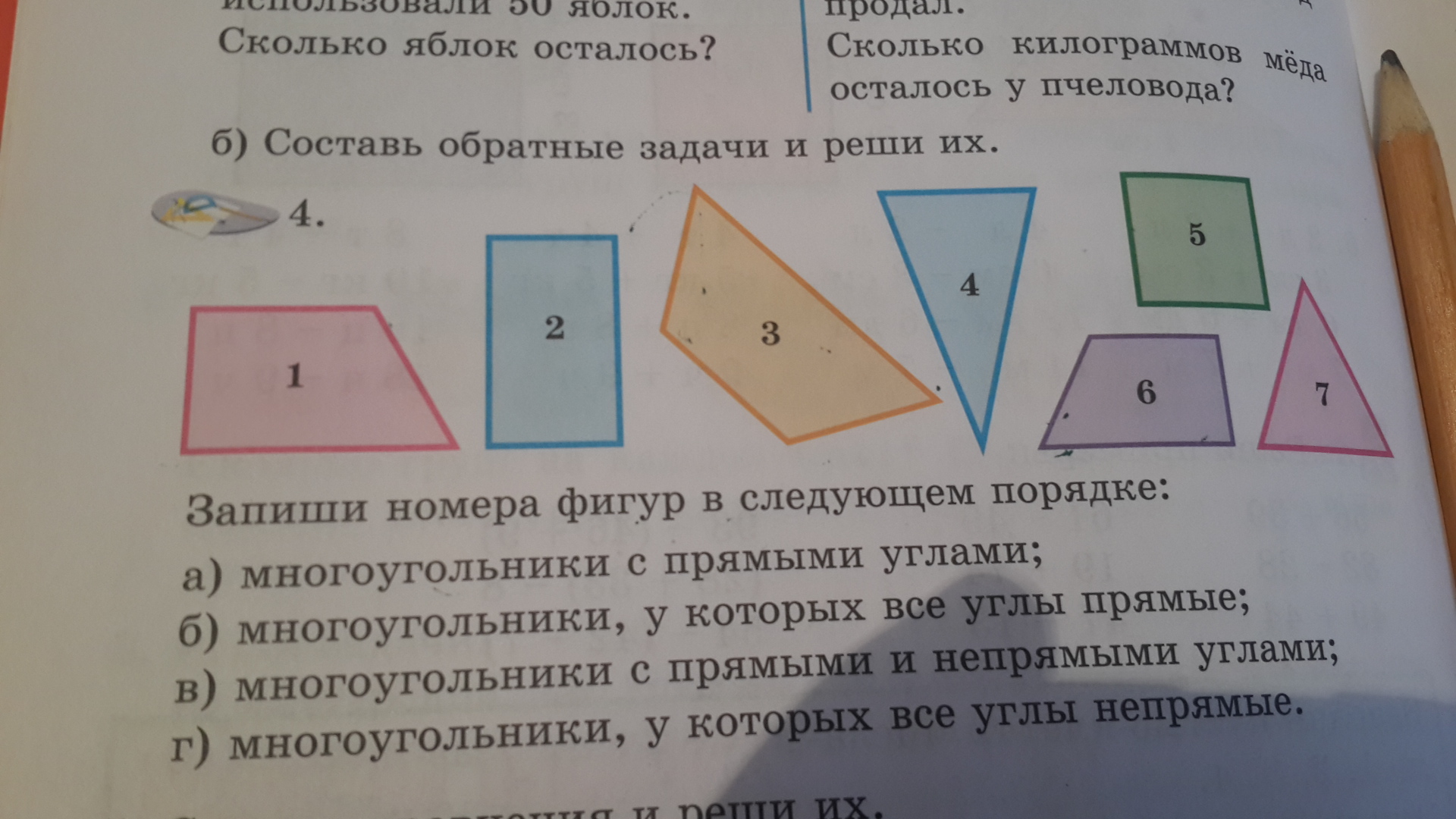 математика 3 класса Состав обратные задачи и реши их. запиши номера фигур в следующем порядке : а ) многоугольники с прямыми углами; б ) многоугольники, у которых все углы прямые; в ) многоугольники с прямыми и непрямыми углами; г ) многоугольники, у которых все углы непрямие.