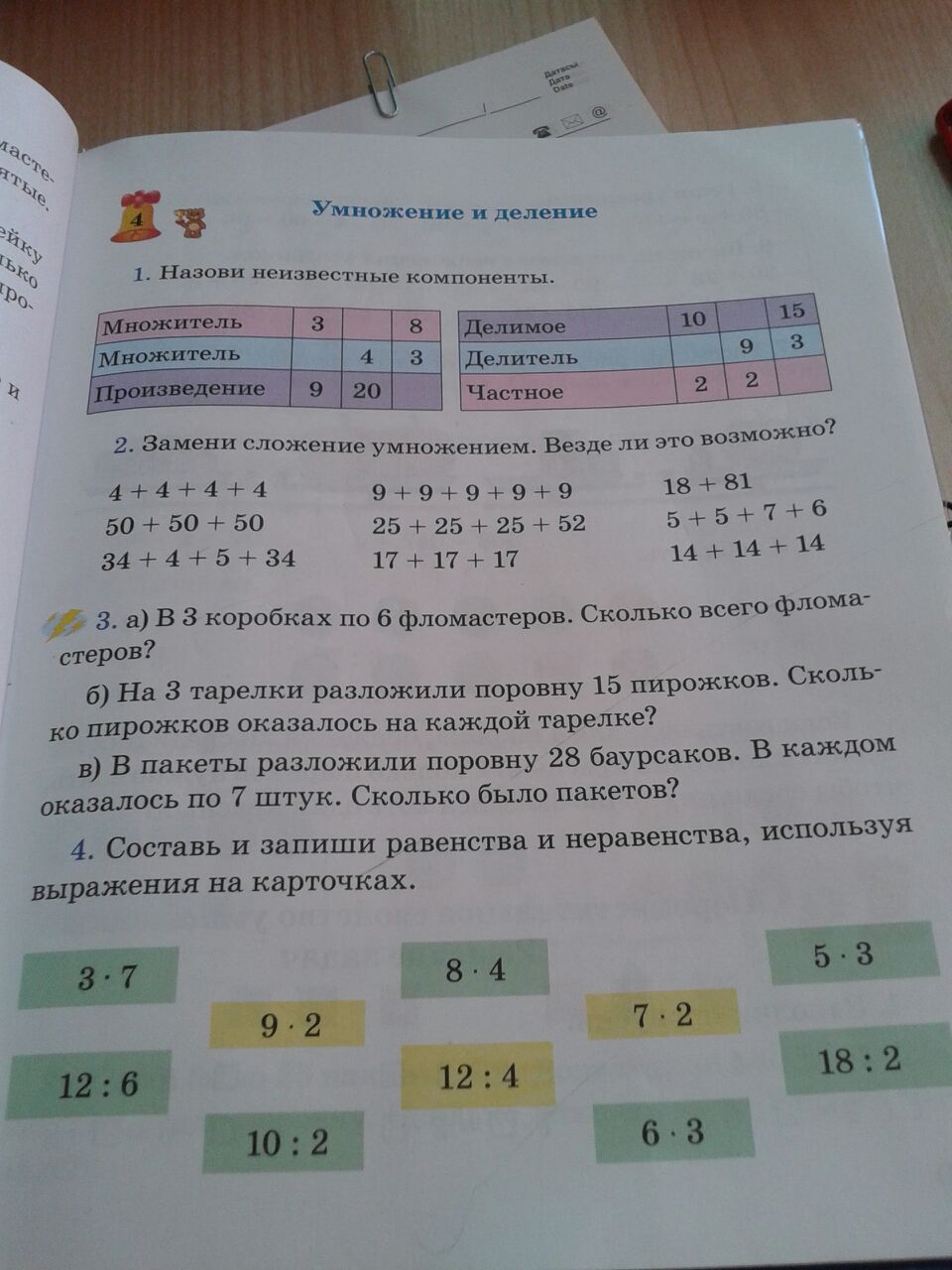 в) Всего было 28 брусков, в каждый пакет уместили 7 брусков. Сколько потребуется пакетов?
