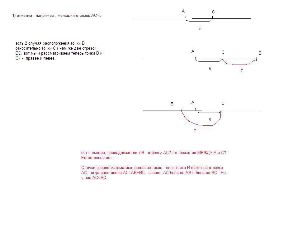 Точки A B C лежат на одной прямой, Принадлежит ли точка B отрезку AC если AC=5см, BC=7 см ? Объясните ответ. Помогите пожалуйста