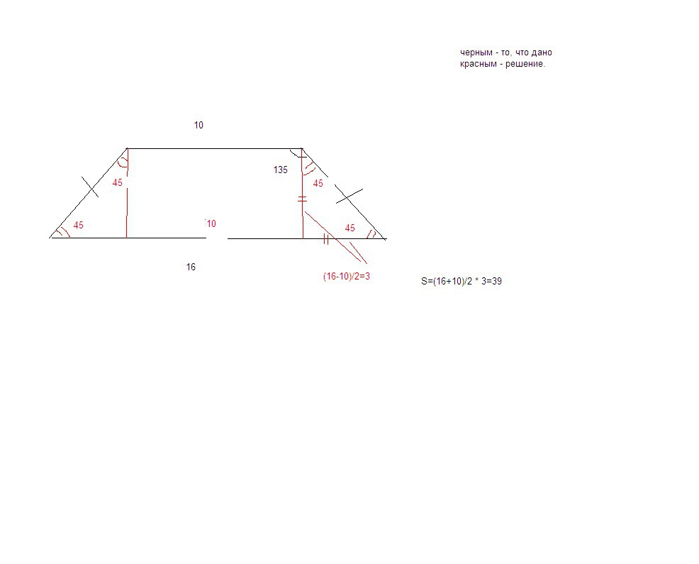Найти площадь равнобедренной трапеции если его основные стороны 10см и 16 см а один из углов равен 135 °