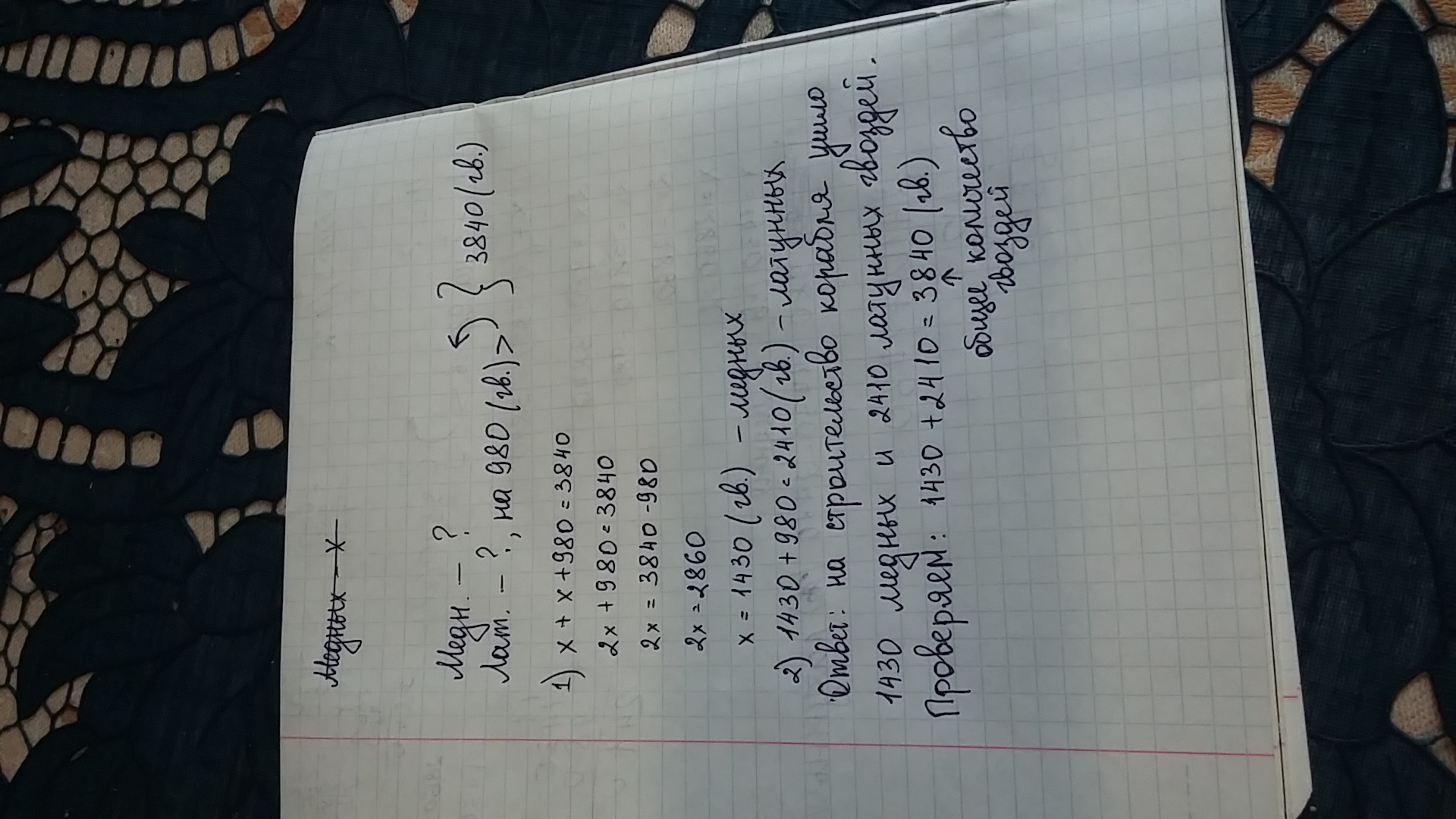 гвозди из меди и латуни не боятся воды. на строительство корабля пошло 3840 медн.и лат.гвоздей. Причем латун.гвозд.ушло на 980 больше чем медн. Ск.мед и ск.лат.гвоздей ушло на строит.корабля?