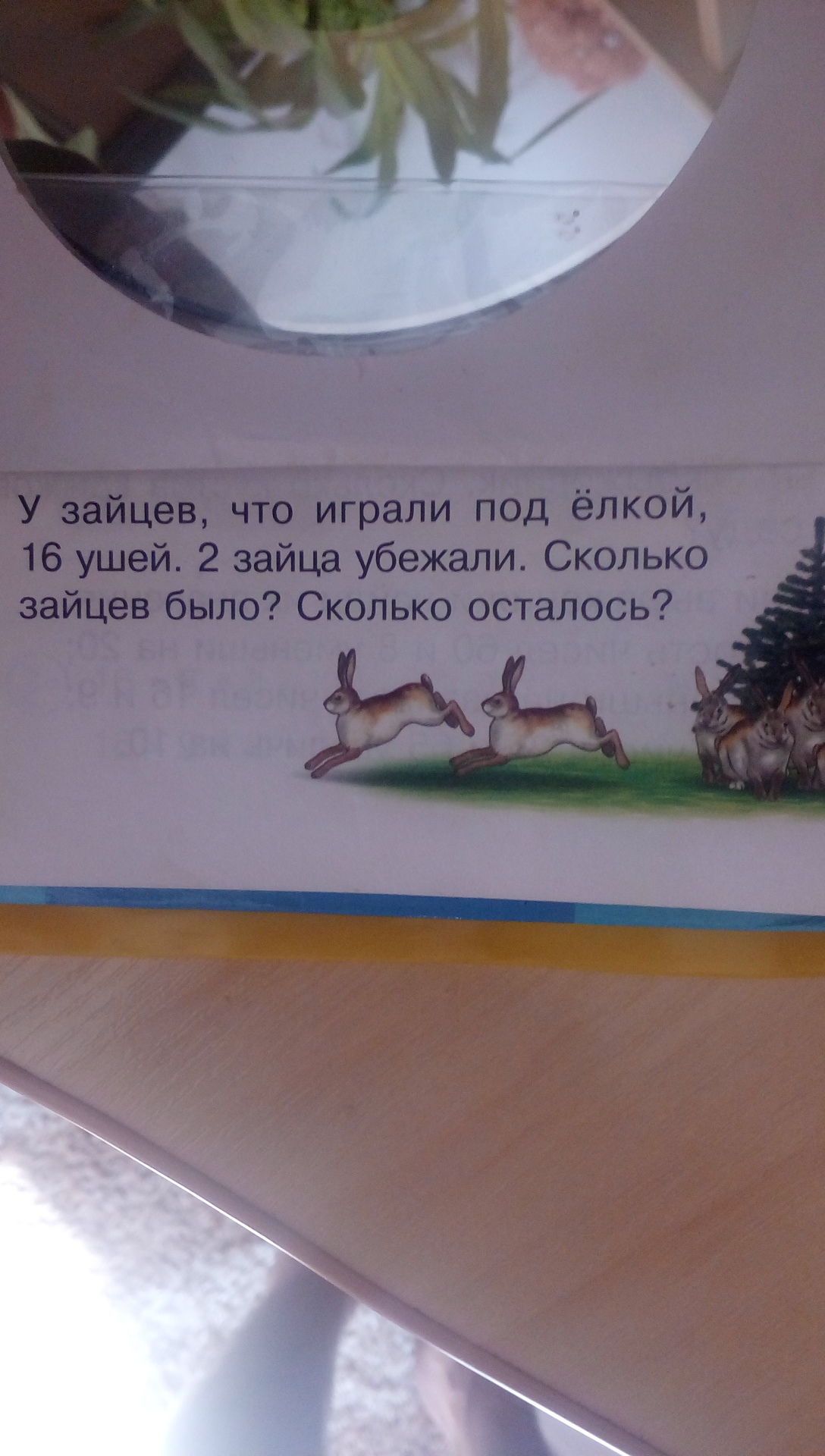 как я поняла.играли 16ушей это значит 16÷2=8зайцев збыло.2убежали,значит 8-2=6осталось.