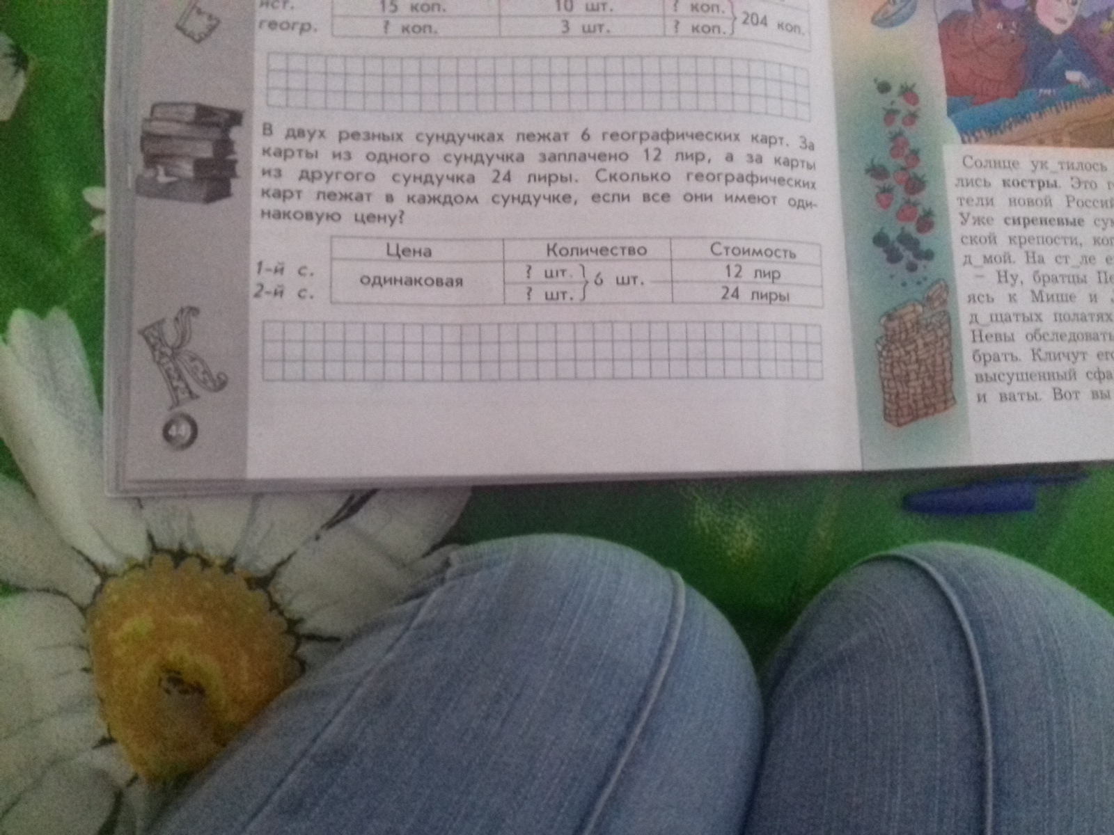 в двух резных сундучках лежат 6 географических карт. за карты из одного сундучка заплачено 12 лир, а за карты из другого сундучка 24 лиры. сколько географических карт лежат в каждом сундучке, если все они имеют одинаковую цену?