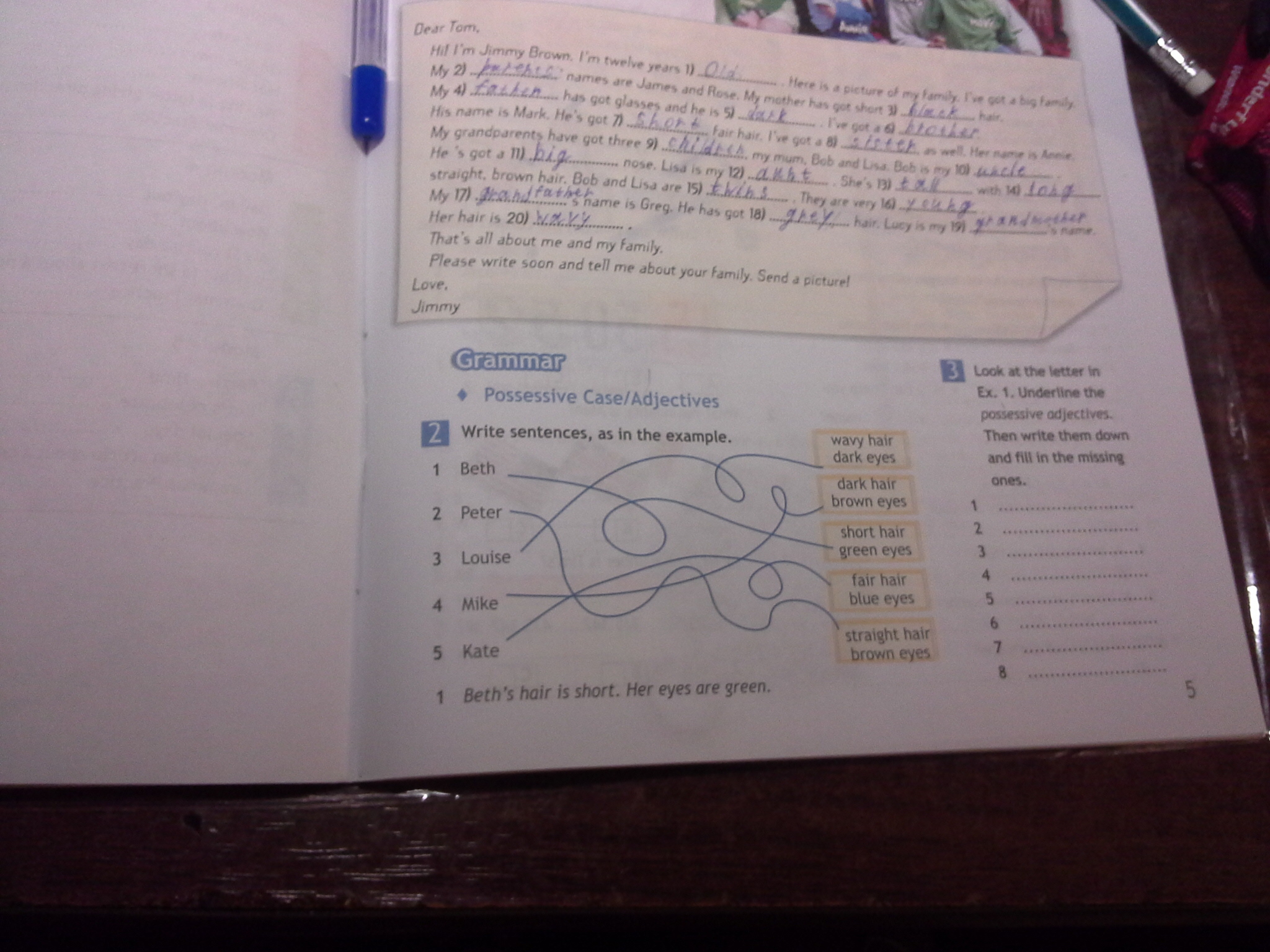 2 Peter`s hair is straight. His eyes are brown. 3 Louise` hair is wavy. Her eyes are dark. 4 Mike`s hair is dark. His eyes are brown. 5 Kate`s hair is fair. Her eyes are blue.