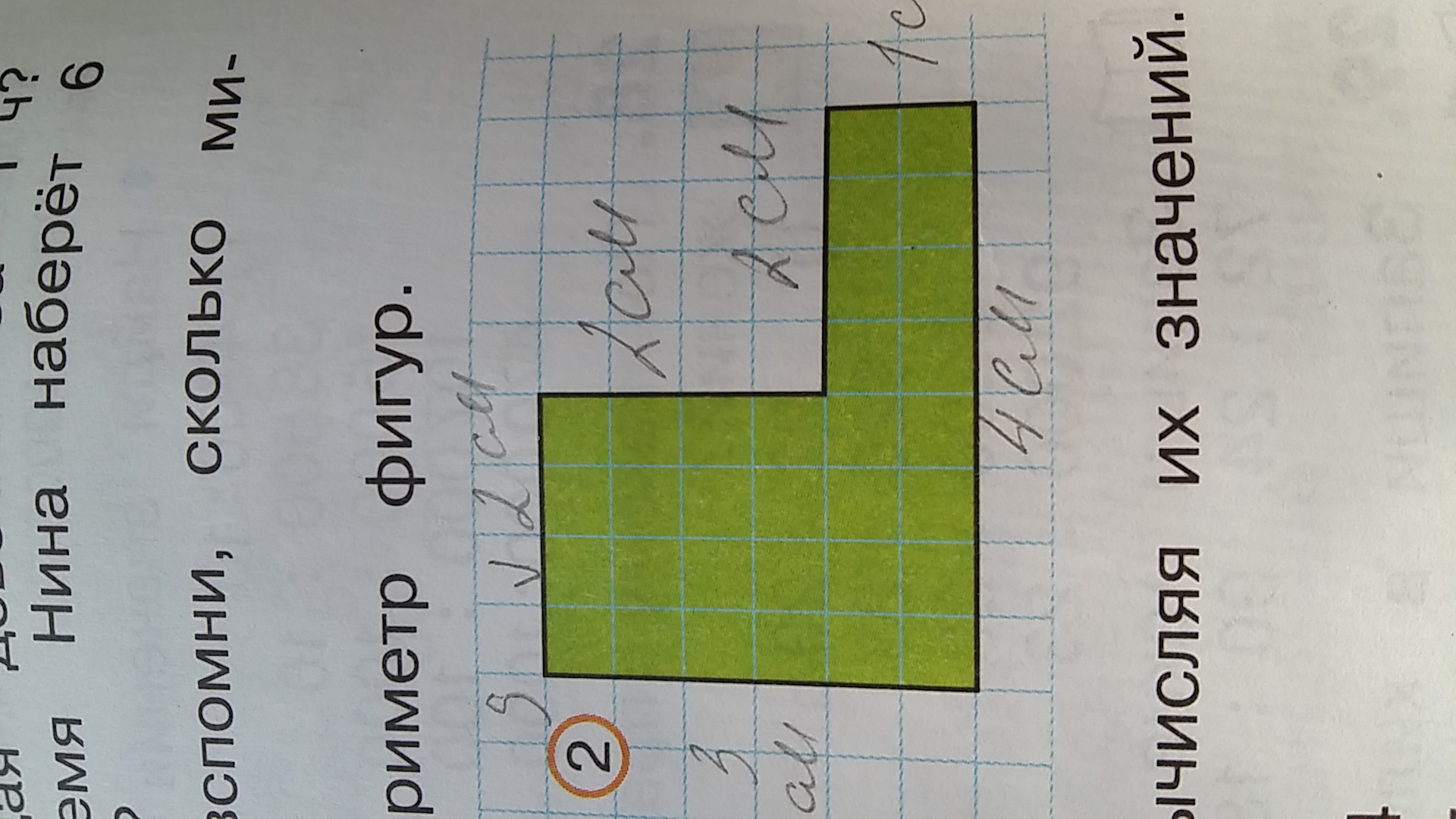 нужно разделить на два прямоугольника. первый 3 см×2 см, второй 2 см × 1 см. общая площадь равна 3*2 + 2*1 = 6 + 2 = 8 квадратных сантиметров.