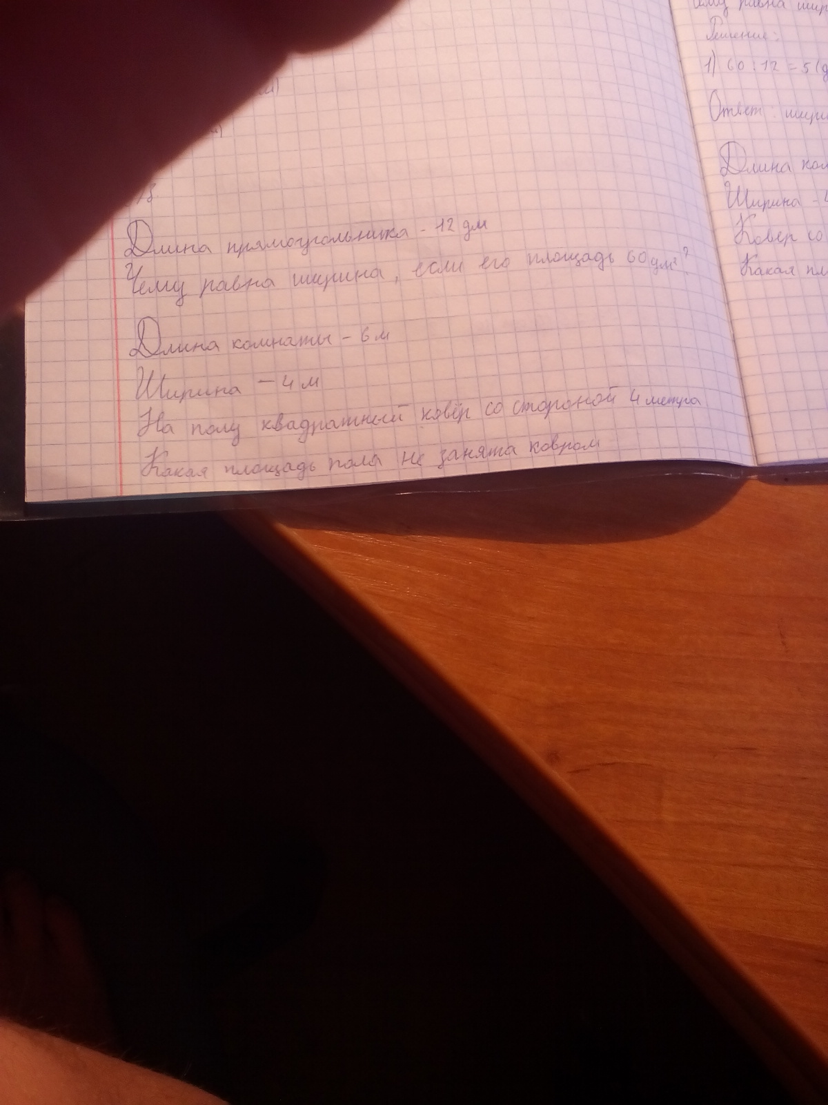 длина комнаты -6 м.ширина -4 м.на полу квадратный ковер со стороной 4 м .какая площадь пола не занята ковром?