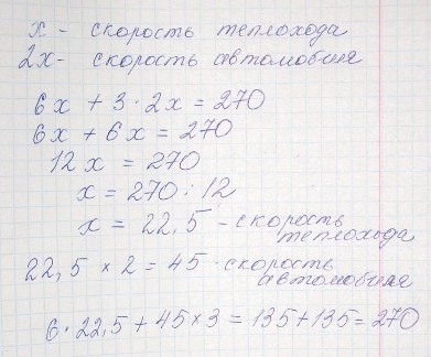туристы проехали 270 км,6 ч они плыли на теплоходе 3 ч ехали на автобусе решение .Найдите скорость теплохода,если она в 2 раза меньше скорости автомобиля