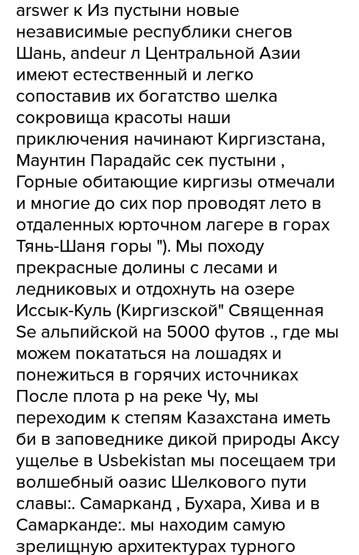 шөл даладан қар Шань жаңа тәуелсіз республикалар Орталық Азияны andeurl табиғи және біздің приключениях оңай олардың байлығы жібек қазына салыстыру сұлулық Қырғызстанға басталады, деп аудандық тауларында с Desert Тау-тұрғын үй Қырғыз: бұл елді мекен және көптеген адамдар әлі күнге дейін Тянь-Шань тауларында шалғай киіз үй қалашығында олардың жаз жұмсайды тау біз ормандар мен мұзды бар әдемі аңғарындағы жорық және Ыстықкөлдегі қырғыз «біз атқа мініп, ыстық су көздерін тамашалауға болады 5000 аяғына Қасиетті Тақтың альпі демалуға біз Қазақстан даласына келіп өзенінің Салдарды өзен losle жануарлар дүниесiн BI бар біз даңқы Жібек жолы. Самарқанд, Бұхара, Хиуа және Самарқанд үш сиқырлы оазисі келуге Өзбекстанда табиғат Ақсу шатқалы. біз ең әсерлі Architech А.Х. МЕРЗІМДІ жАБУ таба