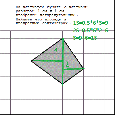Берем, например, красный прямоугольник. Его площадь 3 на 3 клкточки, т.е. 3 * 3 = 9 квадратных см. А серая часть это половина от его площади. 9 : 2 = 4,5 кв.см. И так аналогично со всеми цветными прямоугольниками.