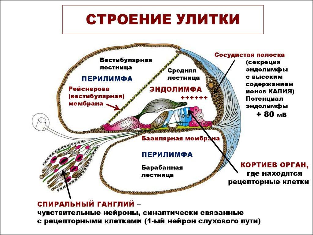 Улитка похожа на ракушку улитки в 2,75 оборота. Это костное образование. Внутри канал улитки разделен двумя мембранами на 3 части. Верхний канал- лестница преддверия (или вестибулярный канал или вестибулярная лестница), средний канал – улитковый канал (или средняя лестница или перепончатый канал), нижний канал – барабанная лестница (или барабанный канал).