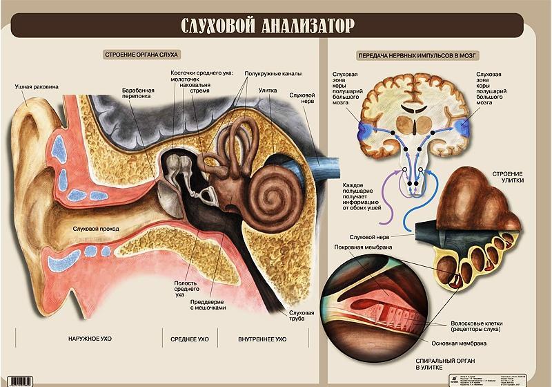 Стремечко передает колебания, полученные от барабанной перепонки и двух слуховых косточек на мембрану овального окна. Она передает колебания жидкости вверх по лестнице преддверия. Доходя до верха, колебания передаются жидкости нижнего - барабанного канала. Колебания жидкостей в верхнем и нижнем каналах приводят в движение жидкость в среднем канале. Основная базилярная мембрана приходит в движение. Рецепторные клетки двигаются вместе с ней и касаются волосками покровной мембраны и генерируют сигнал, который передается по нервам в соответствующий отдел коры головного мозга.