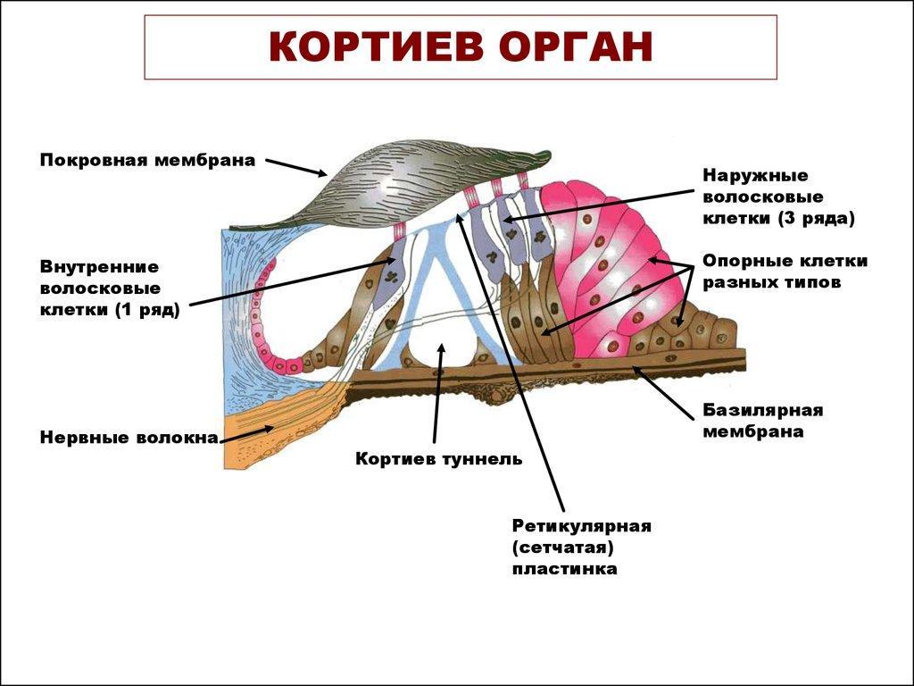 На базилярной мембране располагается кортиев орган. Именно в нем располагаются слуховые рецепторные клетки. Одним концом клетки закреплены на мембране и от них отходит слуховой нерв. Второй конец заканчивается чувствительными волосками. Сверху над рецепторными клетками располагается дополнительная покровная мембрана.