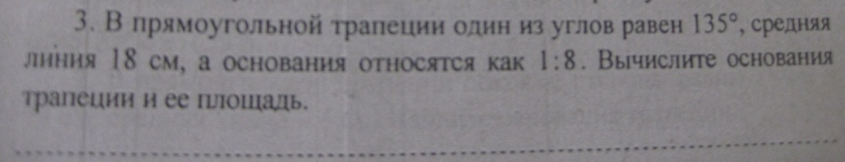 Если отношение 1:8 возьмём меньшее за х а большее основание тогда будет равно 8х