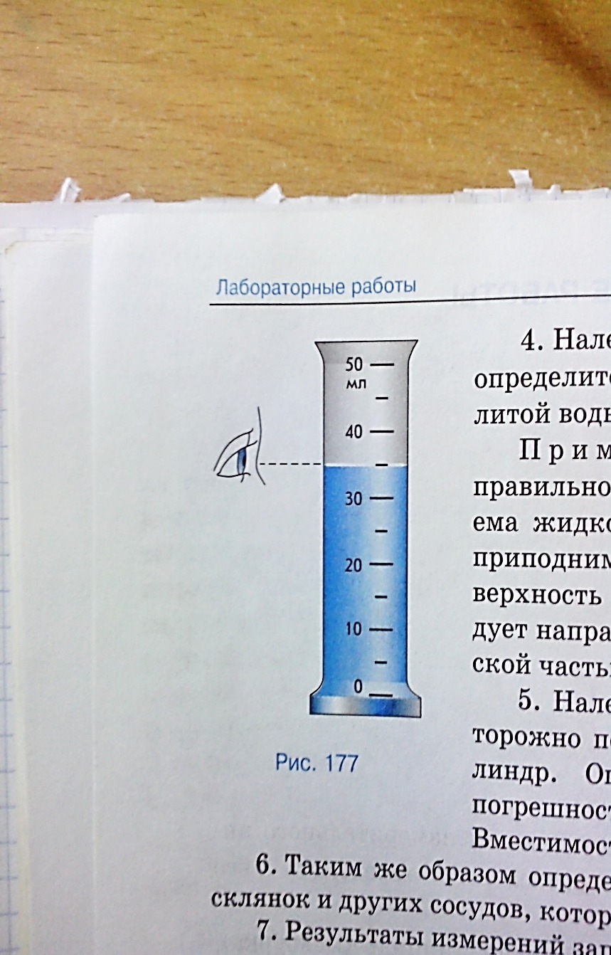 ПРИМЕЧАНИЕ: Обратите внимание на правильное положение глаза при отсчете обьема жидкости. Вода у стенок сосуда немного приподнимается, в средней же части сосуда поверхность жидкости почти плоская глаз следует направить на деление, совпадающее с плоской частью поверхности ( рис. 177)
