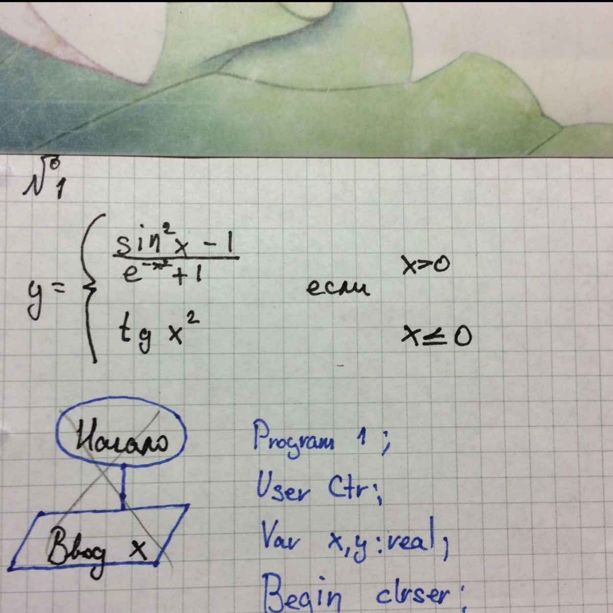 var x,y,e:real;beginread(X);e:=power(2.7,-x*x);if x>0 then y:=(sin(x)*sin(x)-1)/(e+1) else y:=(sin(x)/cos(x))*(sin(x)/cos(x));writeln(y);end.