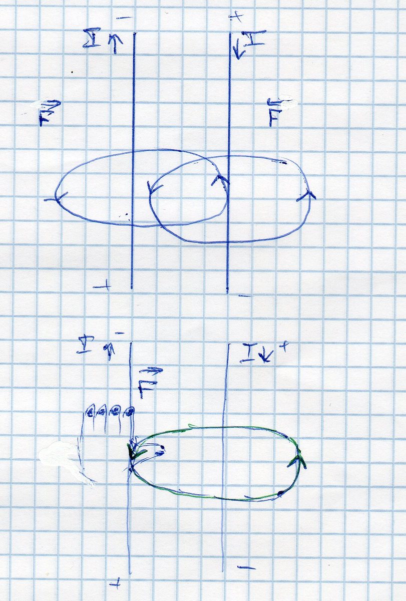 2)В общем, применив правило буравчика, можно понять, что направление силовых линий двух проводников встречно и они отталкиваются друг от друга. Правило левой руки показывает нам вектор силы, действующей на проводники ,и ещё, как я понял, по правилу левой руки можно определить направление силы магнитного поля, действующей на каждый проводник другого проводника. Эти силы направлены навстречу друг другу, значит, они противодействут и отталкиваются.