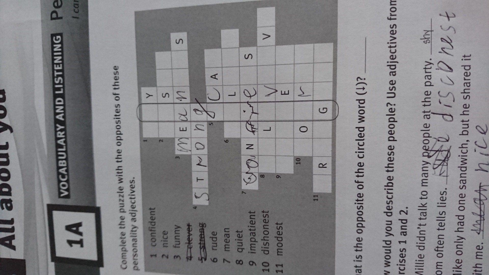 1. Shy, 2. nasty, 3. serious, 4 не strong, a stupid, 5. weak, 6. polite, 7. generous, 8. Talkative 9. Patient, 10. Honest, 11. Arrogant Выделенное слово hardworking