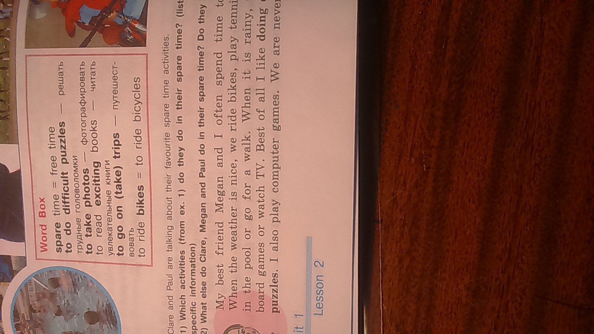 Googl має перекладач в якому ти можеш фоткатися текст і воно перекладає. Мій найкращий друг Меган і зазвичай час від часу коли гарна погода ми катаємося на велосипедах , граємо теніс, гуляємо . Коли дощана погода дивимося телевізор . Я зазвичай граю комп'ютерні ігри.