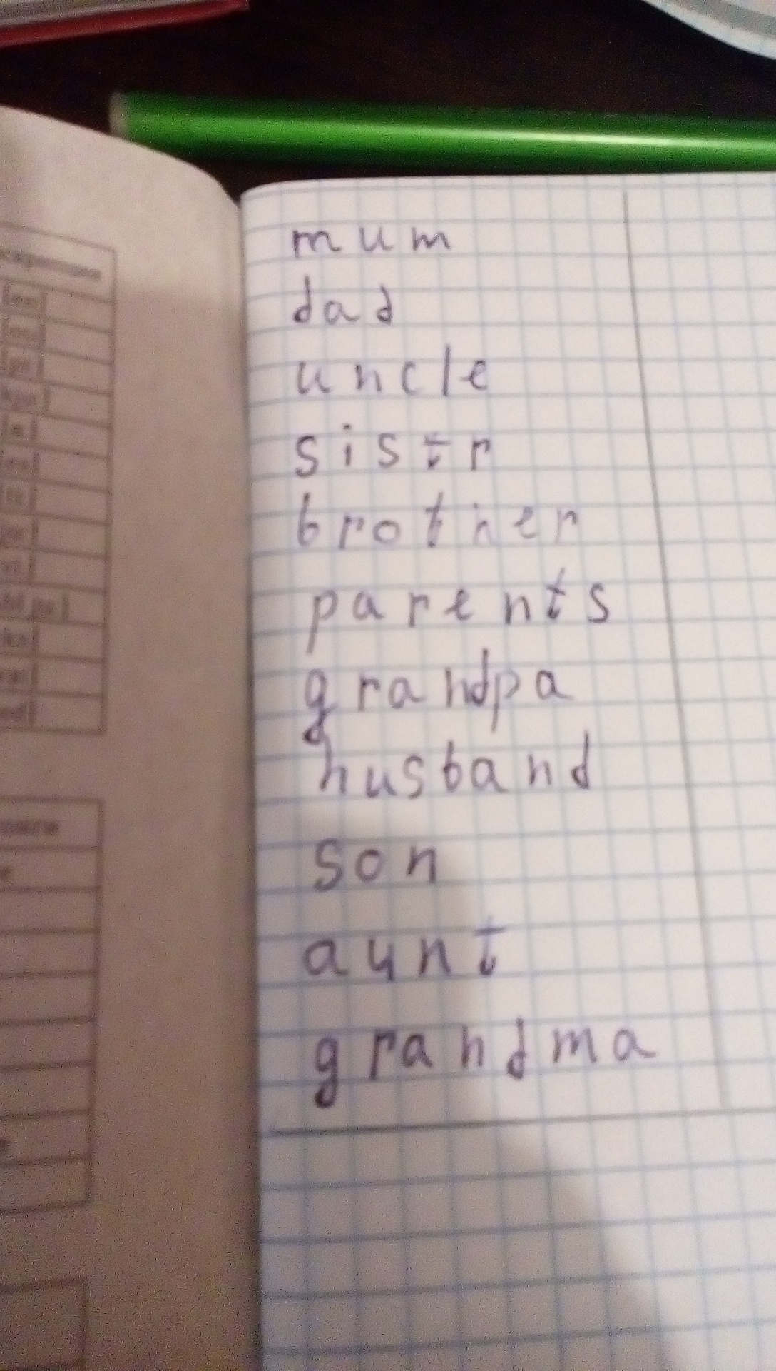 мом,дэд,анкл,систер, браза,пэрэнтс,грандпа,хусбэнд,сон,аунт,грандма.