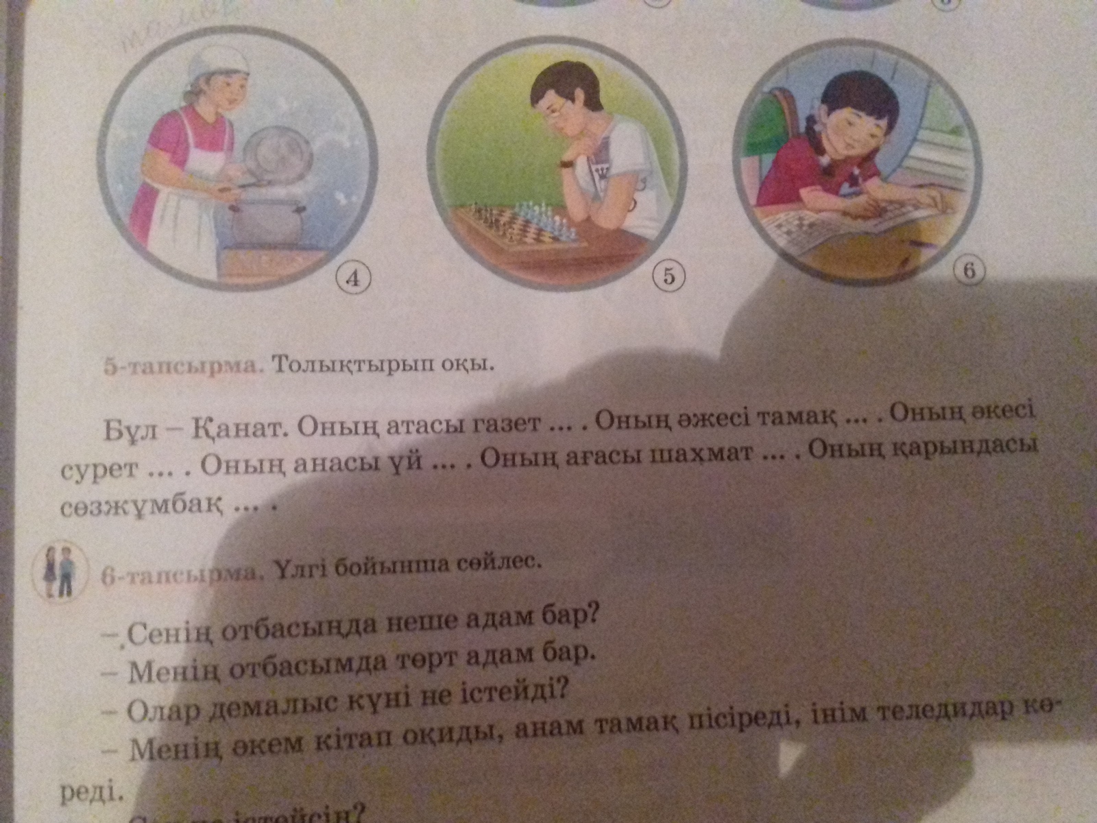 Это Канат.Его дедушка читает газету. Его бабушка готовит еду.Его папа рисует.Его мама убирает дом.Его брат играет шахмат.Его сестренка разгадывает загадки.