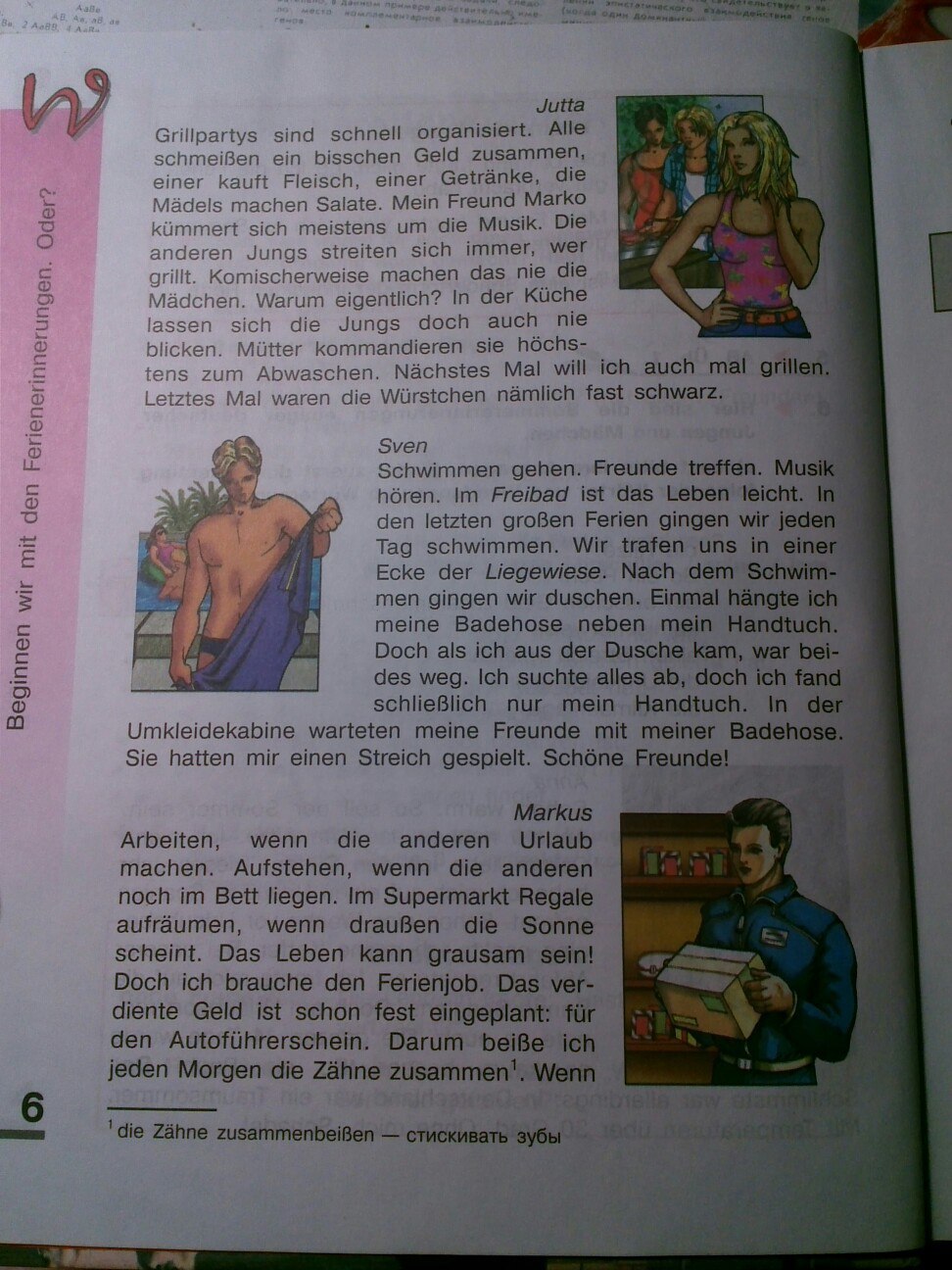 Свен: Ходить плавать. Встречаться с друзьями. Слушать музыку. Жизнь так легка (прекрасна), когда ты в бассейне. В последние долгие каникулы мы каждый день ходили плавать. Мы встречались в одном определенном месте/углу на площадке для лежания. После купания мы шли в душ. Один раз я повесил мои плавки рядом с моим полотенцем. Но когда я вернулся из душа, обе вещи пропали. Я все вокруг обыскал, но нашел только мое полотенце. В кабинке для переодевания меня ждали мои друзья с моими плавками. Они хотели подшутить надо мной. Хорошие же у меня друзья!