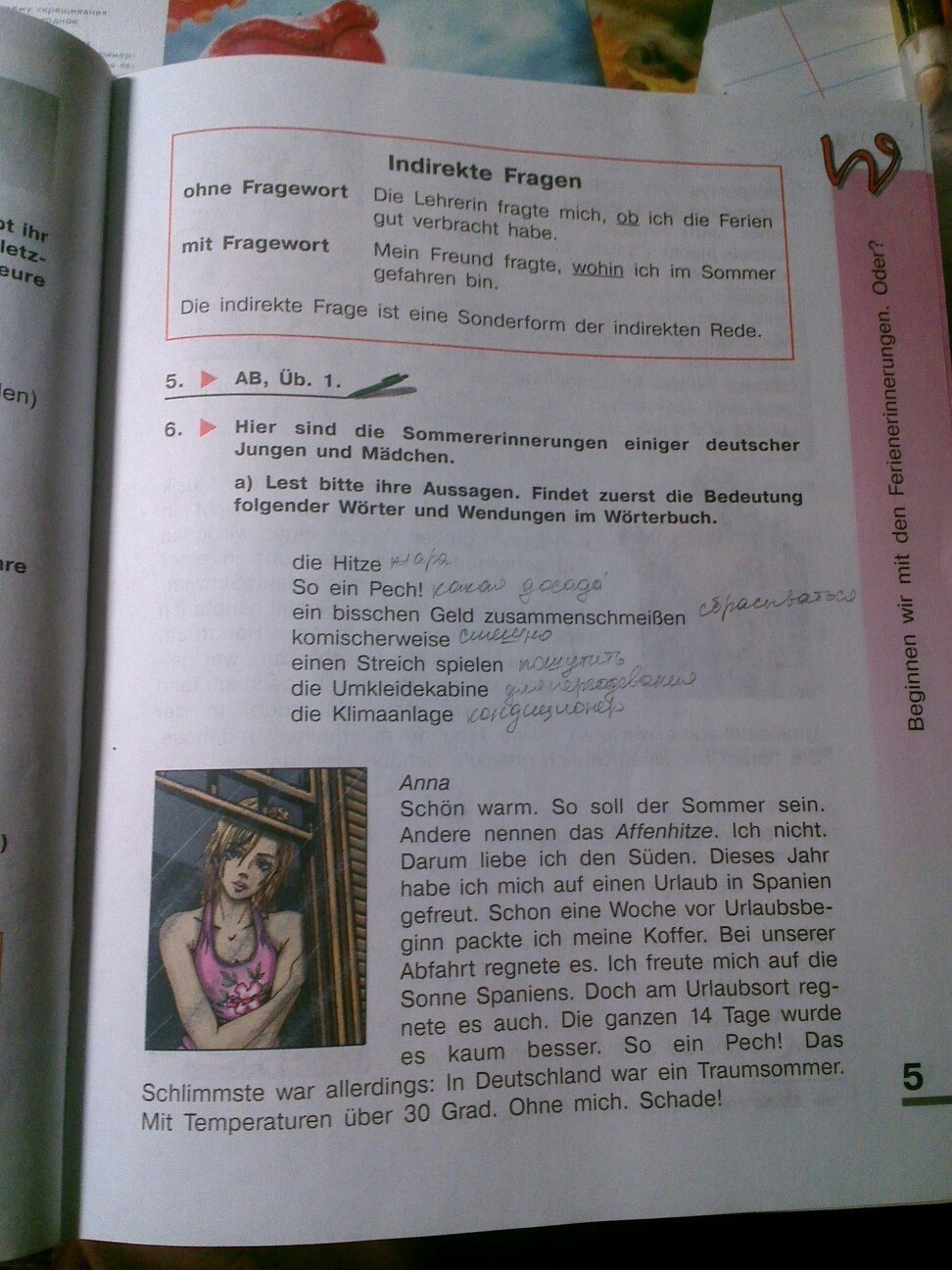 Анна: Так замечательно тепло. Именно таким должно быть лето. Некоторые называют такую погоду "зверской жарой". Но не я. Поэтому я люблю юг. В этом году я очень радовалась моему предстоящему отпуску в Испании. За неделю до начала отпуска я уже паковала чемоданы. Когда мы уезжали, шел дождь. Я так радовалась испанскому солнцу. Но на месте нашего отдыха тоже шел дождь. И все 14 дней было не лучше. Какая досада! Но самое ужасное: в Германии было лето моей мечты. Температура поднималась выше 30 градусов. И это все без меня. Жаль!