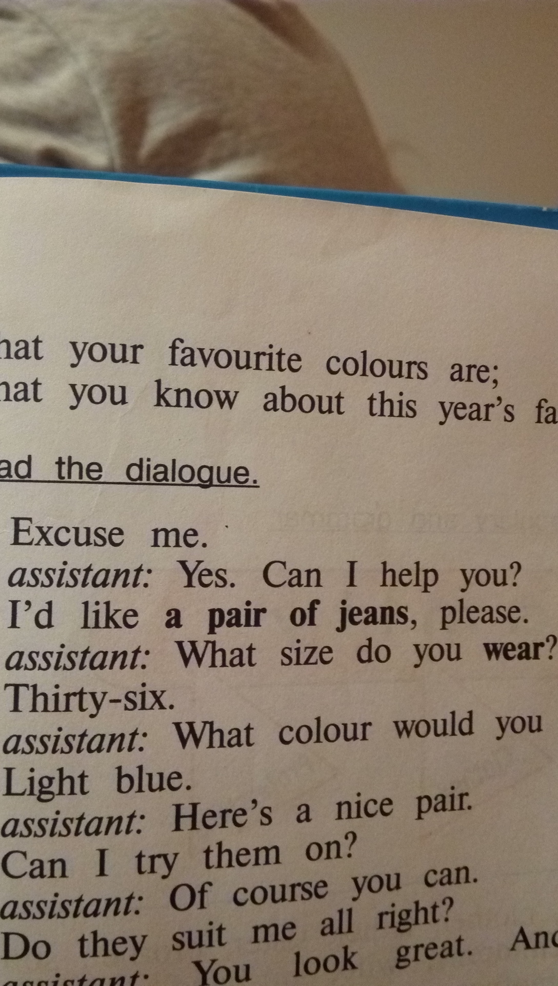 Кто-то: Я бы хотел купит пару джинс, пожалуйста