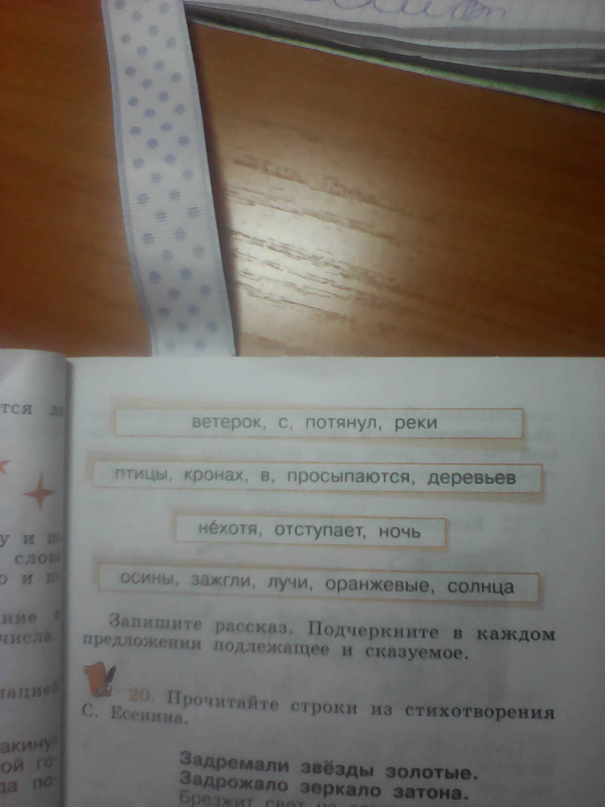 Ветерок(подлежащее)потянул(сказуем)с реки. В кронах деревьев просыпаются(сказ.) птицы(подл.)