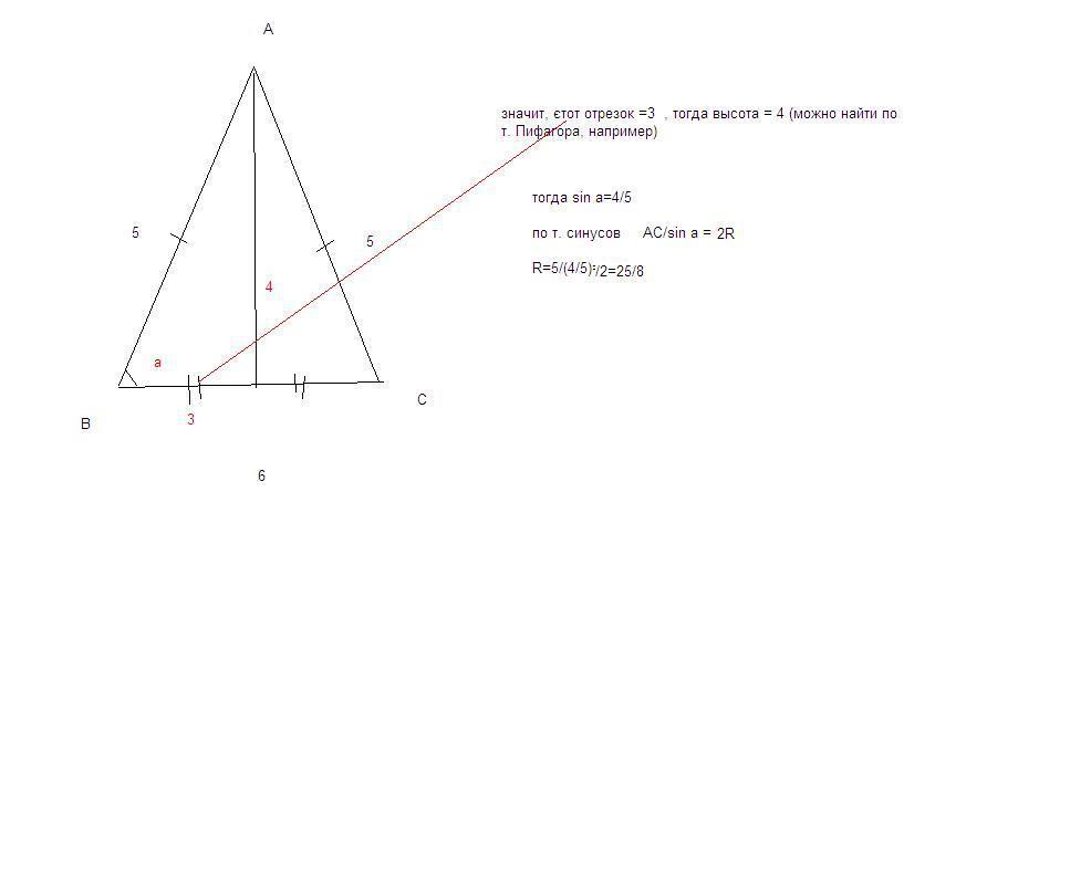 задан равнобедренный треугольник A B равно A C равно 5 BC равно 6 найдите радиус описанной окружности