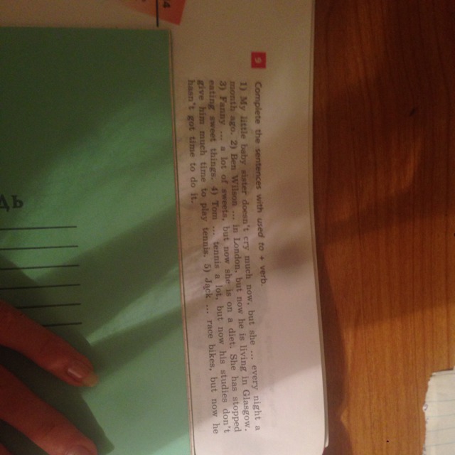 Дополните предложения с используется для глагола она каждый нуклеотида 1) Мой маленький ребенок сестра не плачет много сейчас, но живет в G месяц назад. 2) Бен Уилсон в Лондоне, но теперь он мне 30 Фанни много сладостей, но теперь она находится на диете. Она имеет Ting сладкие вещи. s) Том теннис много, но теперь его Studie много времени, чтобы играть в теннис, 5) Джек гоночных мотоциклов, но нет времени, чтобы сделать это.