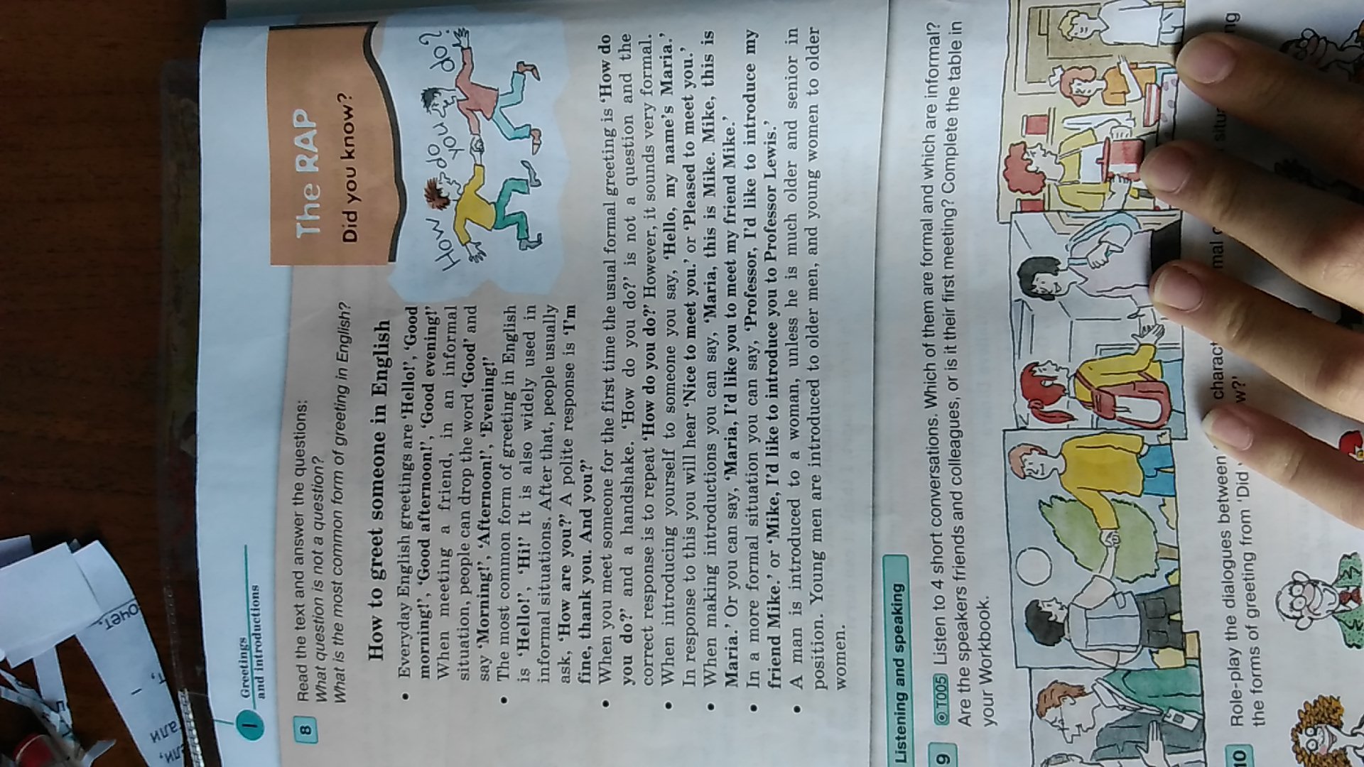 Когда ты встречаешь кого-то в первый раз, обычная форма приветствия это: "Как дела?", и пожать руку. "Как дела?" не вопрос, а правильным ответом будет повторение "Как дела?" Однако это звучит очень формально.