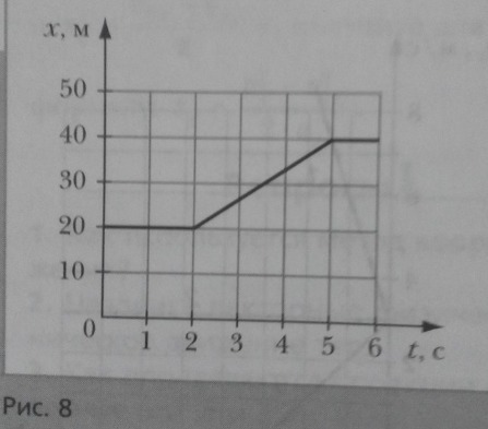 На рис. 8 изображен график зависимости координаты тела от времени. Чему равны а) координата перемещения тела в момент времени t=5 c; б) модуль скорости движения тела? В какой интервал времени координату x можно определить по формуле x=x0 + Ux * t?
