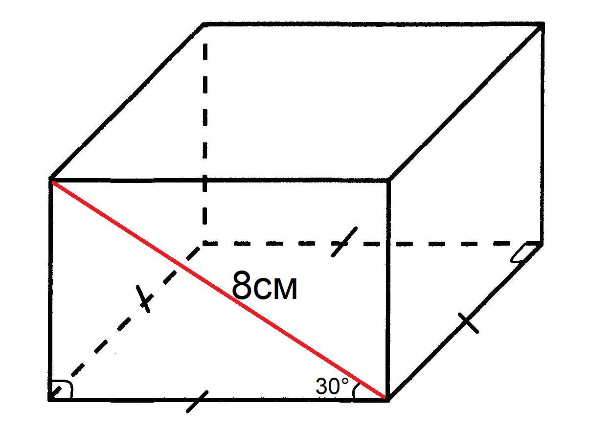 основою прямокутного паралелепіпеда є квадрат. Діагональ бічної грані паралелепіпеда дорівнює 8 см і утворює з площиною основи кут 30 градусів. Знайдіть обЄм паралелепіпеда.