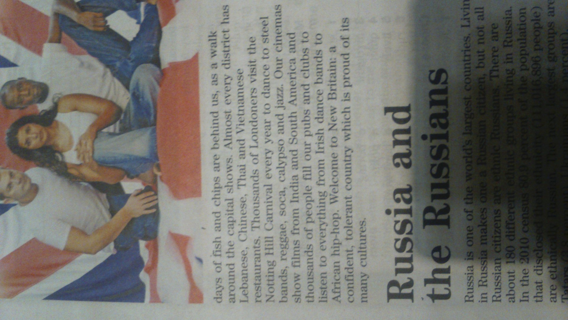 ни рыбы и чипсов находятся позади нас, как прогулка вокруг столицы показывает. Почти каждый район имеет ливанское, китайский, тайский и вьетнамский рестораны. Тысячи лондонцев посетить Ноттинг Хилл карнавал каждый год, чтобы танцевать под стальными лентами, регги, калипсо, ПОПР и джаз. Наши кинотеатры показывают фильмы из Индии и Южной Америки и тысячи людей заполняют наши пабы и клубы, чтобы слушать все, от ирландских танцевальных групп до африканского хип-хопа. Добро пожаловать в Новая Британия: уверенно, толерантная страна, которая гордится своими многочисленными культурами.