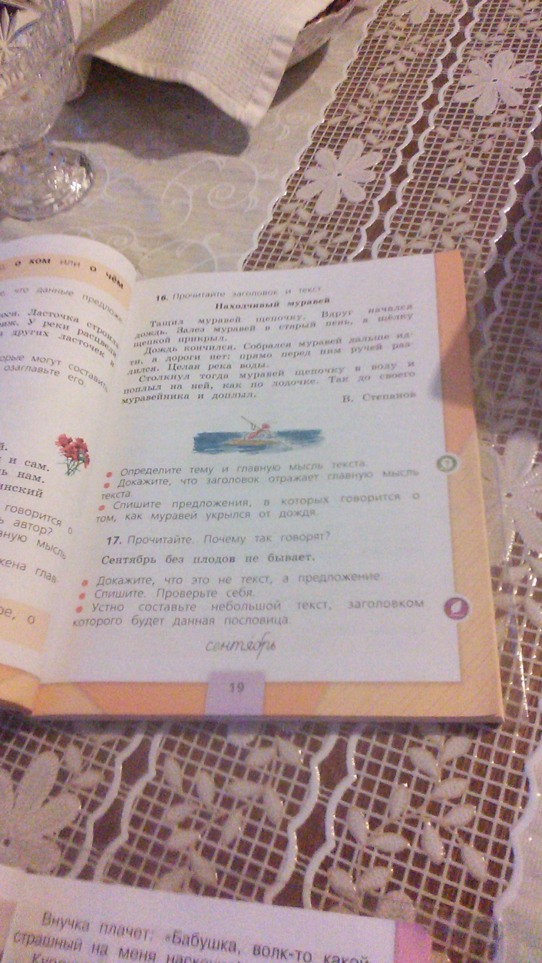 Муравей спустился к ручью: захотел напиться. Волна захлестнула его и чуть не потопила. Голубка несла ветку. Она увидела - муравей тонет, и бросила ему ветку в ручей. Муравей сел на ветку и спасся.