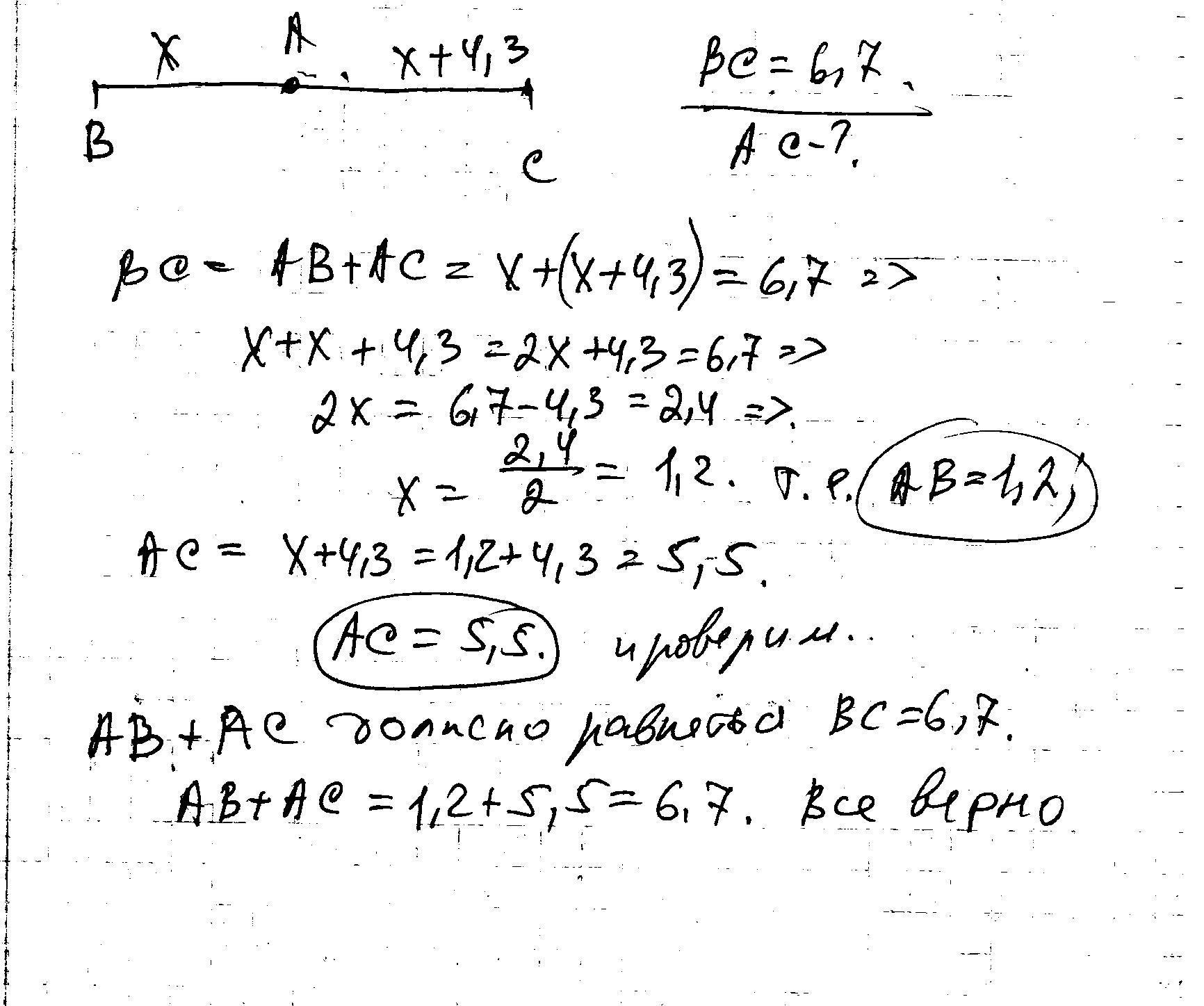 Точки А, В, С лежат на одной прямой. Точка А лежит между точками В и С. АВ=x,АС=x+4,3;ВС=6,7 найдите длину отрезка АС