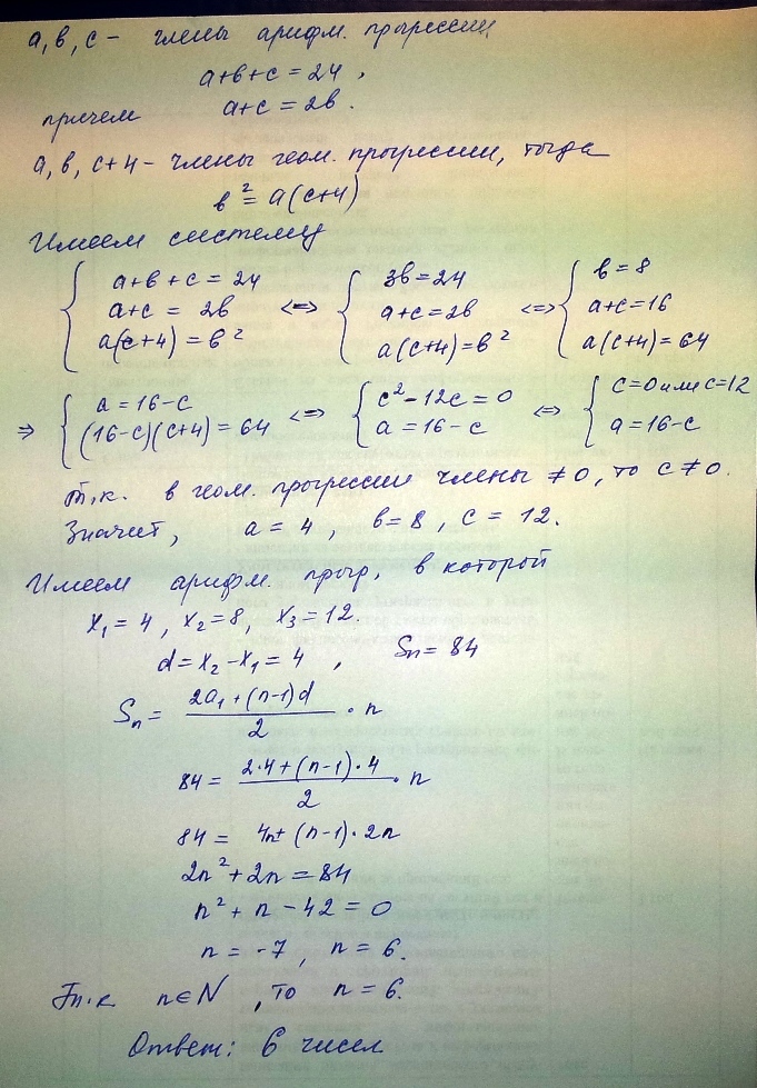 Сумма трёх чисел, составляющих возрастную арифметическую прогрессию,равна 24. Если третье число увеличить на 4, то полученные три числа составят геометрическую прогрессию. Сколько членов арифметической прогрессии надо взять,чтобы их сумма была равна 84? Спасибо.