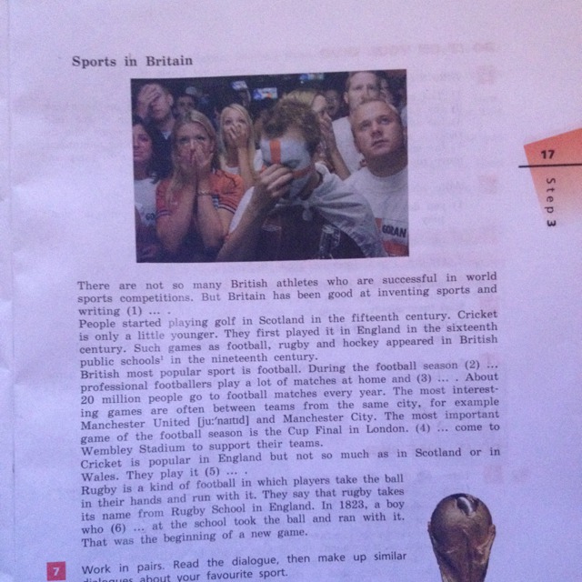 Самый популярный спорт в Великобритании - это футбол. Во время футбольных сезонов 2)... профессиональные футболисты играют множество матчей у себя дома и 3)... Около 20 миллионов человек ходят на футбол каждый год. Самые интересные игры чаще всего бывают между командами из одного города, например, Manchester United и Manchester City. Самые важные игры во время футбольного сезона - это Финал Кубка мира в Лондоне. 4)... приходят к стадиону Уэмбли, чтобы поддержать свои команды.