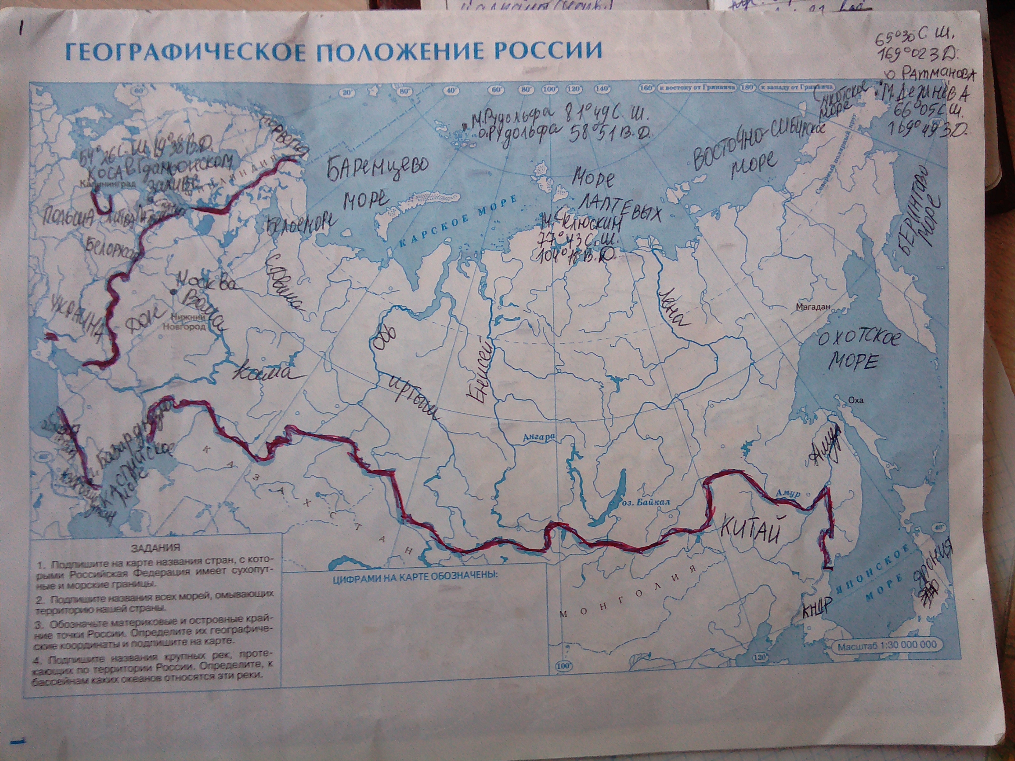 на контурной карте отметить крайние точки, моря, границы, страны соседи. ( Карта российской Федерации)