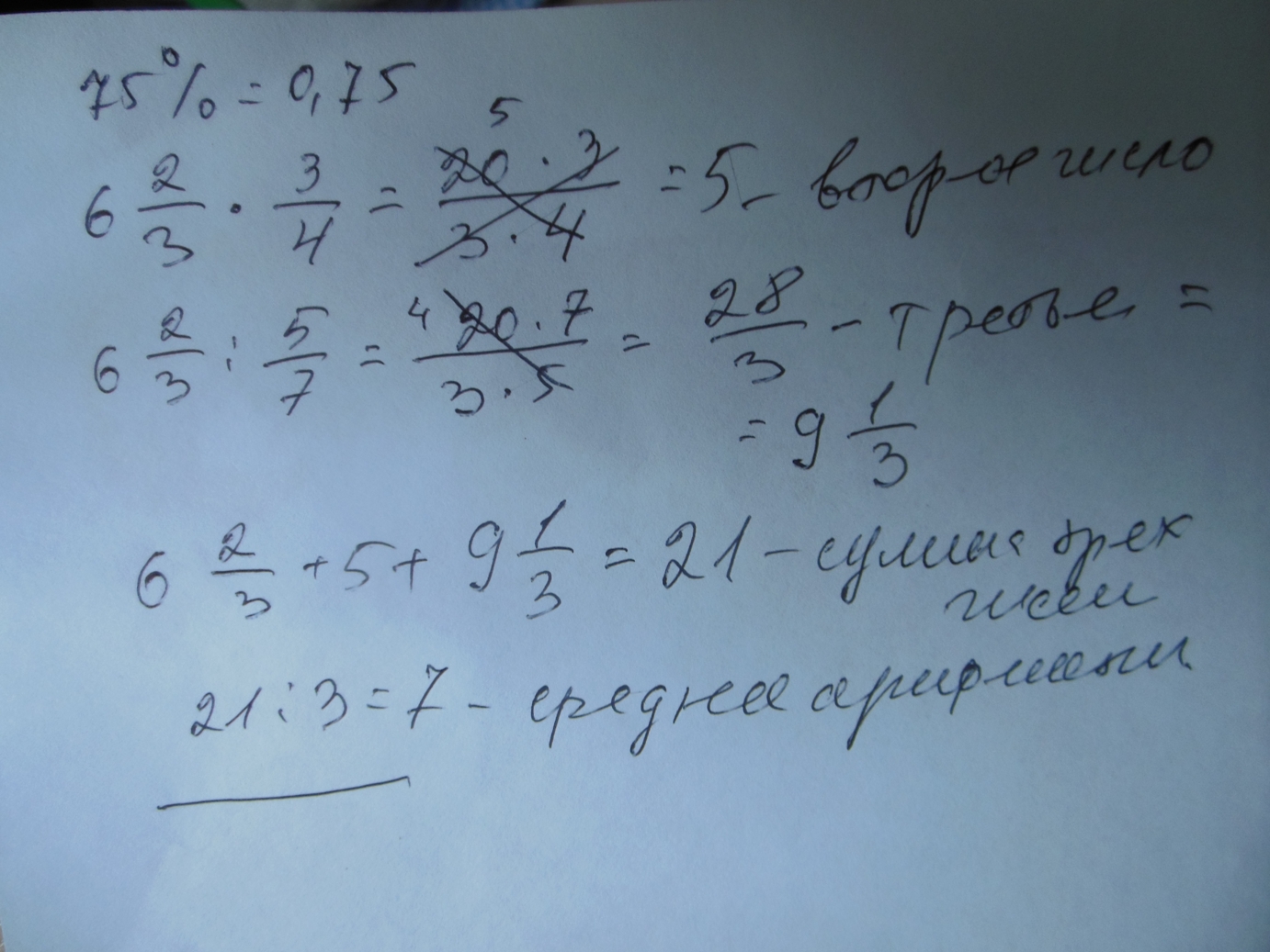 Помогите решить задачу:имеется 3 числа первое число равно 6целых2/3второе число составляет 75 процентов первого числа и 5/7 третьего найдите средние арифметическое этих чисел