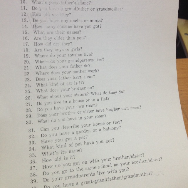38. Ты ходишь в одну школу со своей сестрой/братом? 39. Твои дедушки и бабушки живут с тобой? 40. Есть ли у тебя прадедушки и прабабушки?