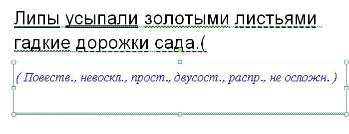 Липы-сущ., подлежащие. Усыпали-гл.,сказуемое. Листьями-сущ.,дополнение. Золотыми- (какими?) прил.,определение. Дорожки-сущ.,дополнение. Гладкие- (какие?) прил., определение. Дорожки (чего?) сада- сущ., дополнение.